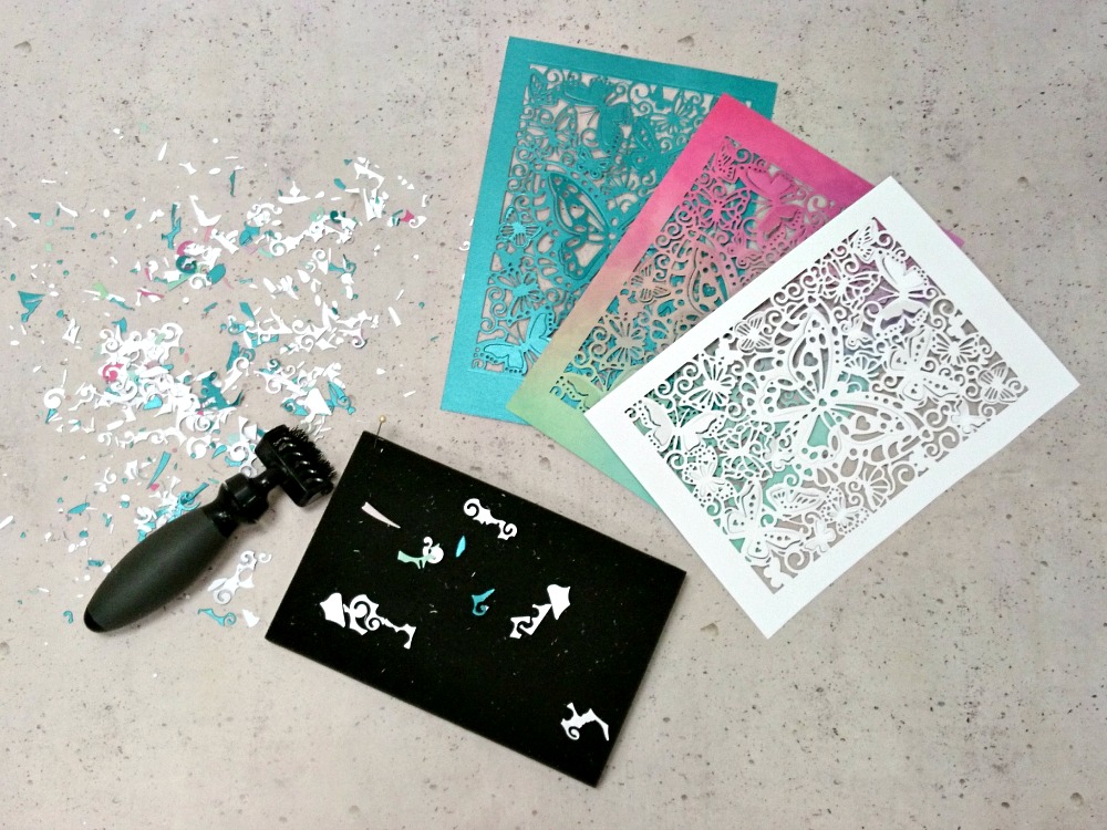 Ko je motiv izrezan, si pri čiščenju drobnih izrezanih delčkov pomagamo s posebno vrtljivo krtačko. Pripravimo si več izrezov iz različnih papirjev.