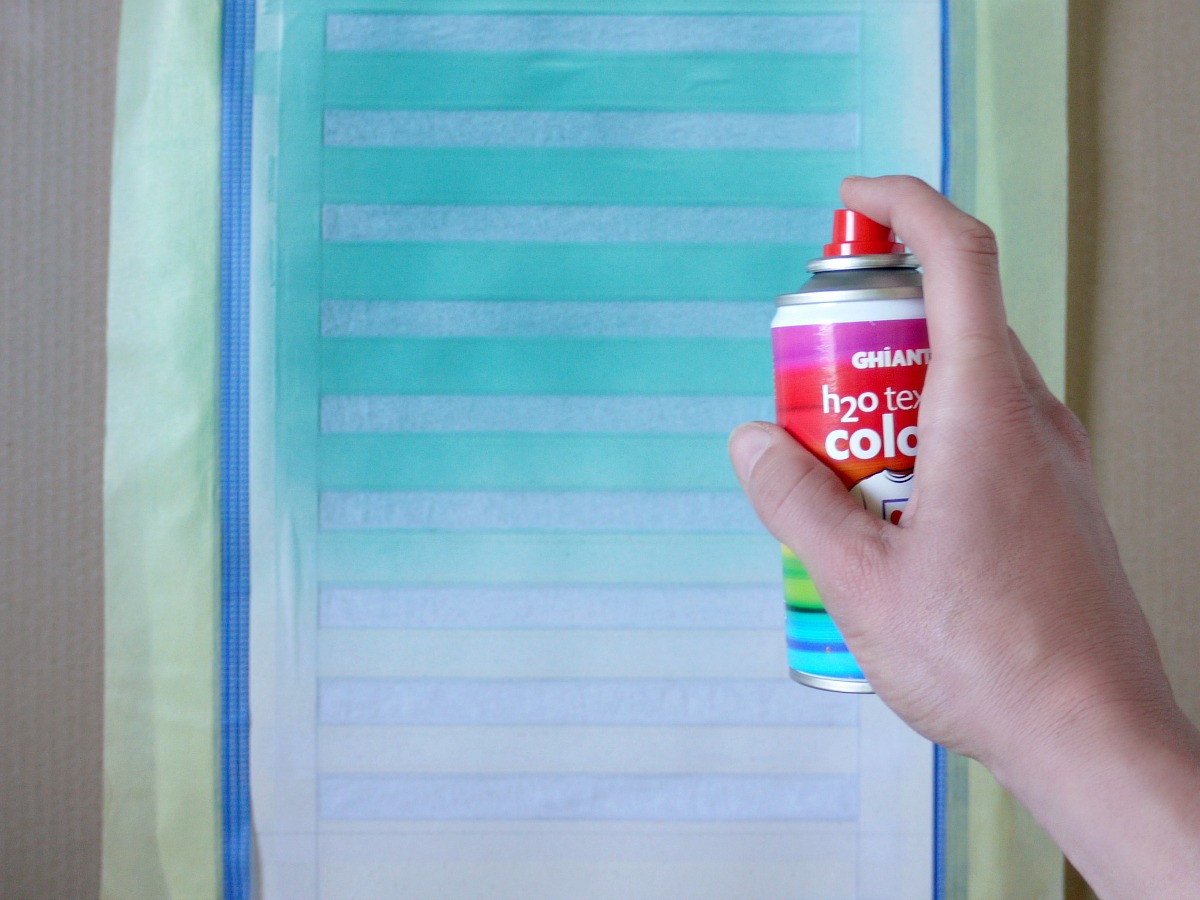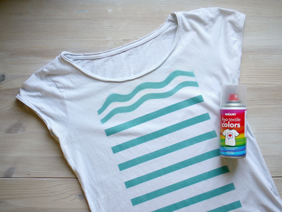 Iz kartona ali samolepilne folije izrežemo šablono in jo ob robovih zalepimo čez sprednji del majice. Majico nato prebarvamo s sprejem za tekstil.