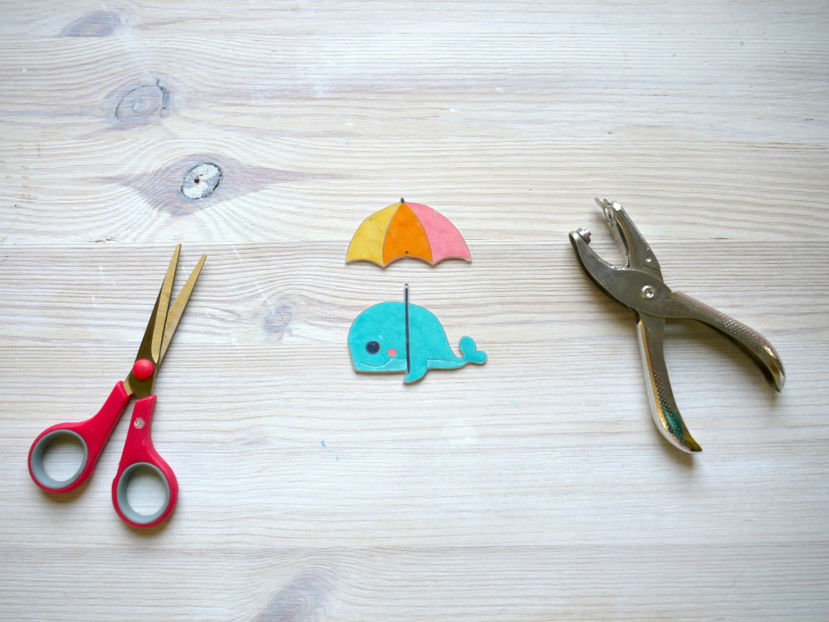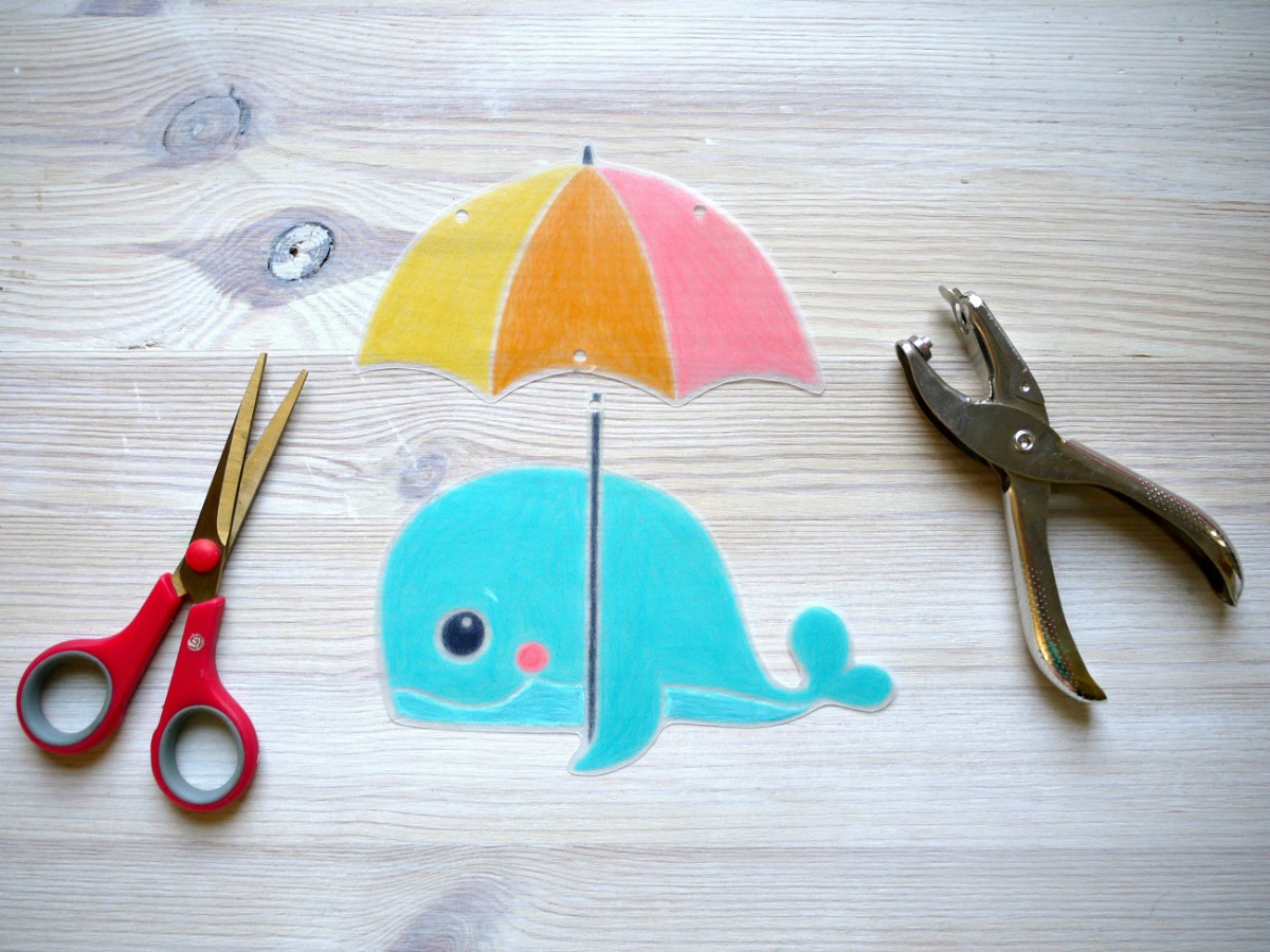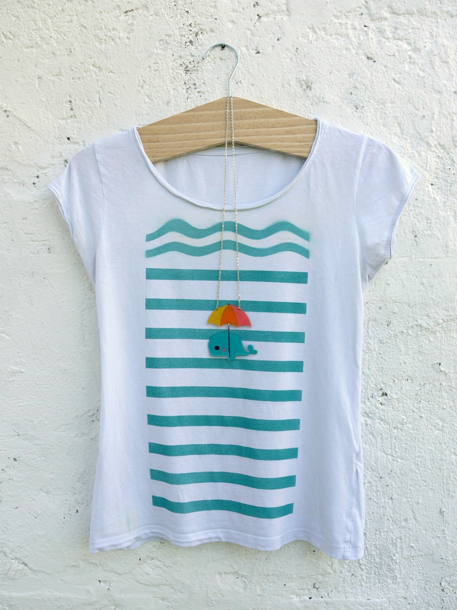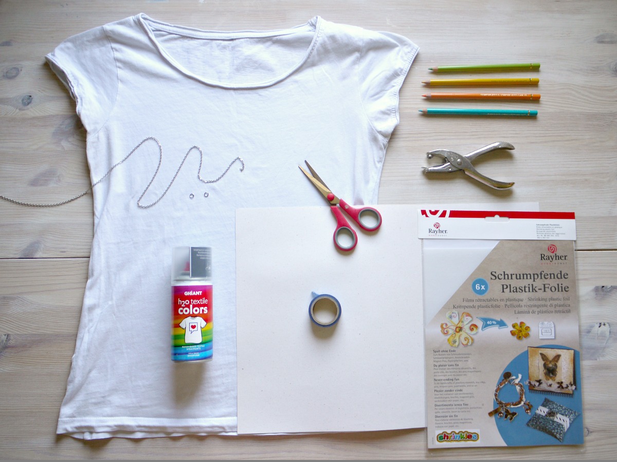 S spreji za tekstil in skrčljivo folijo lahko naredimo prav zabaven komplet majice in poletnega nakita. Mi smo se odločili za morski motiv s kitom.Potrebujemo: