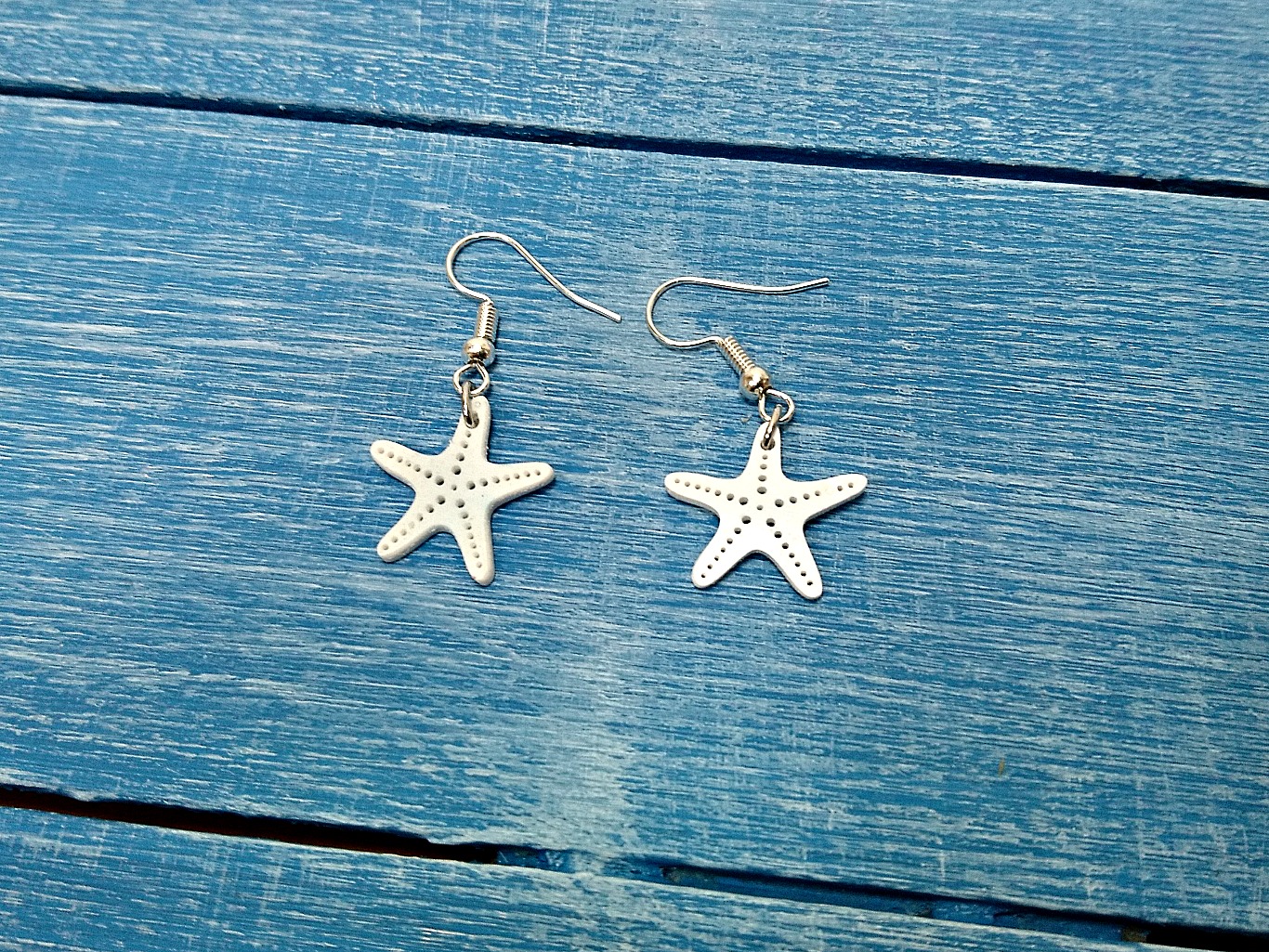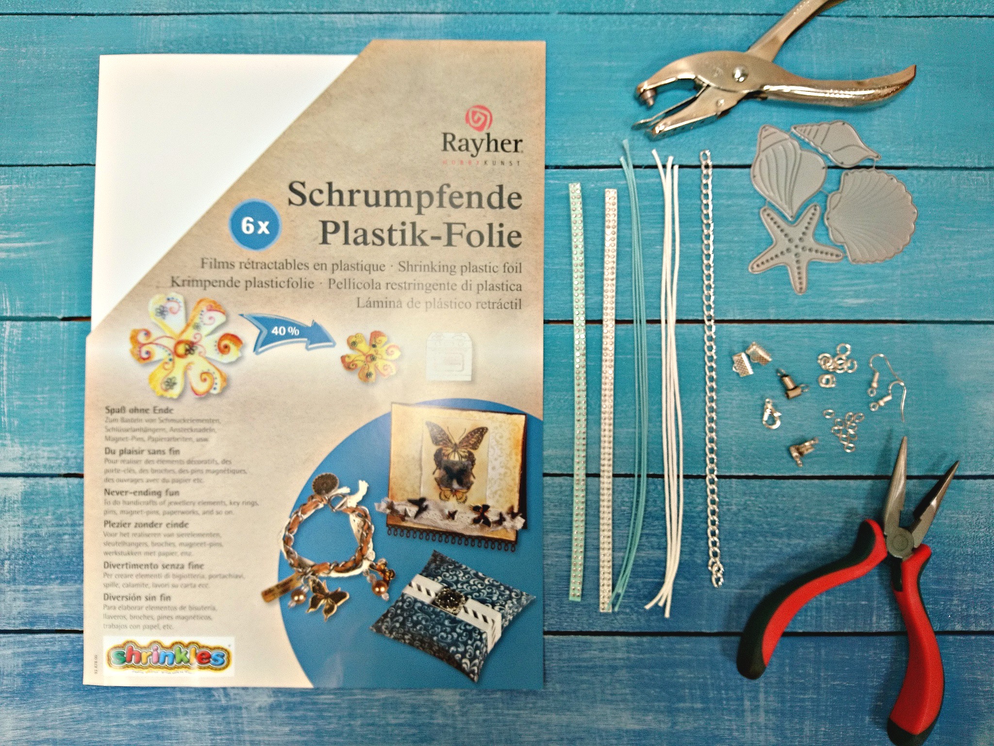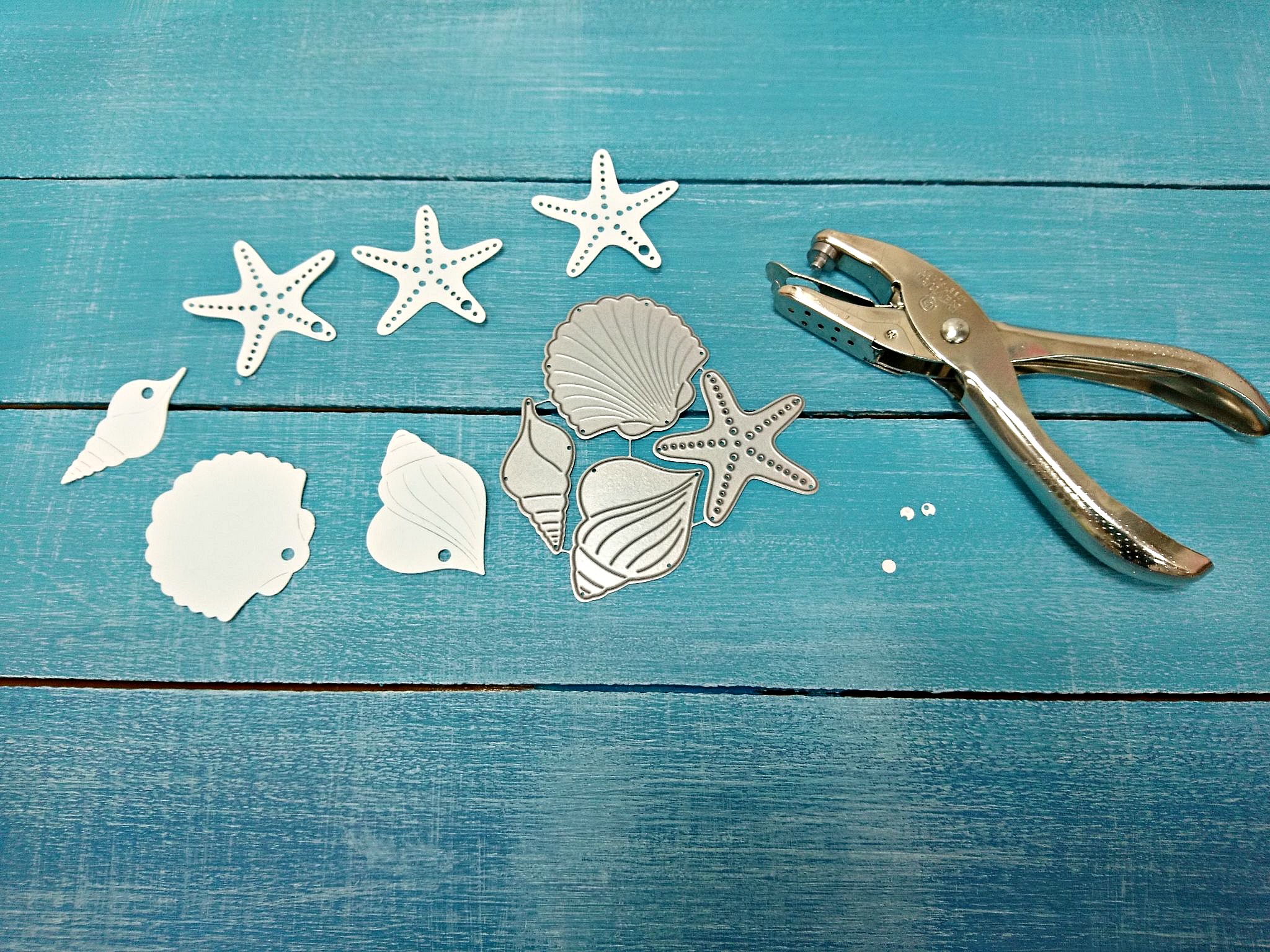 Iz bele skrčljive folije z Big Shotom in šablono izrežemo en komplet školjk in tri morske zvezde. Dve zvezdi bomo uporabili za uhane. Vse elemente preluknjamo z ustrezno velikim luknjačem, saj se ob krčenju tudi luknjice zmanjšajo.