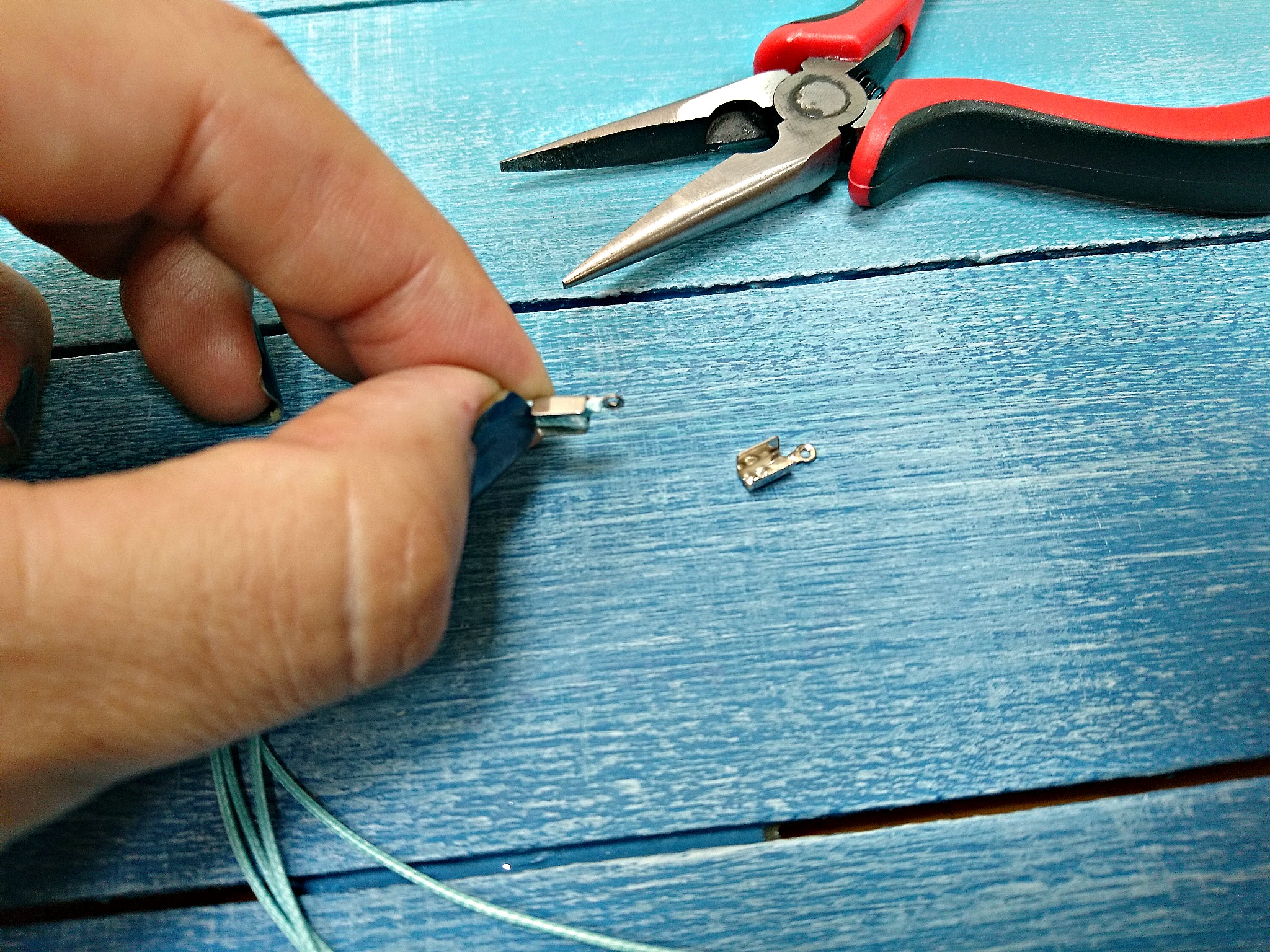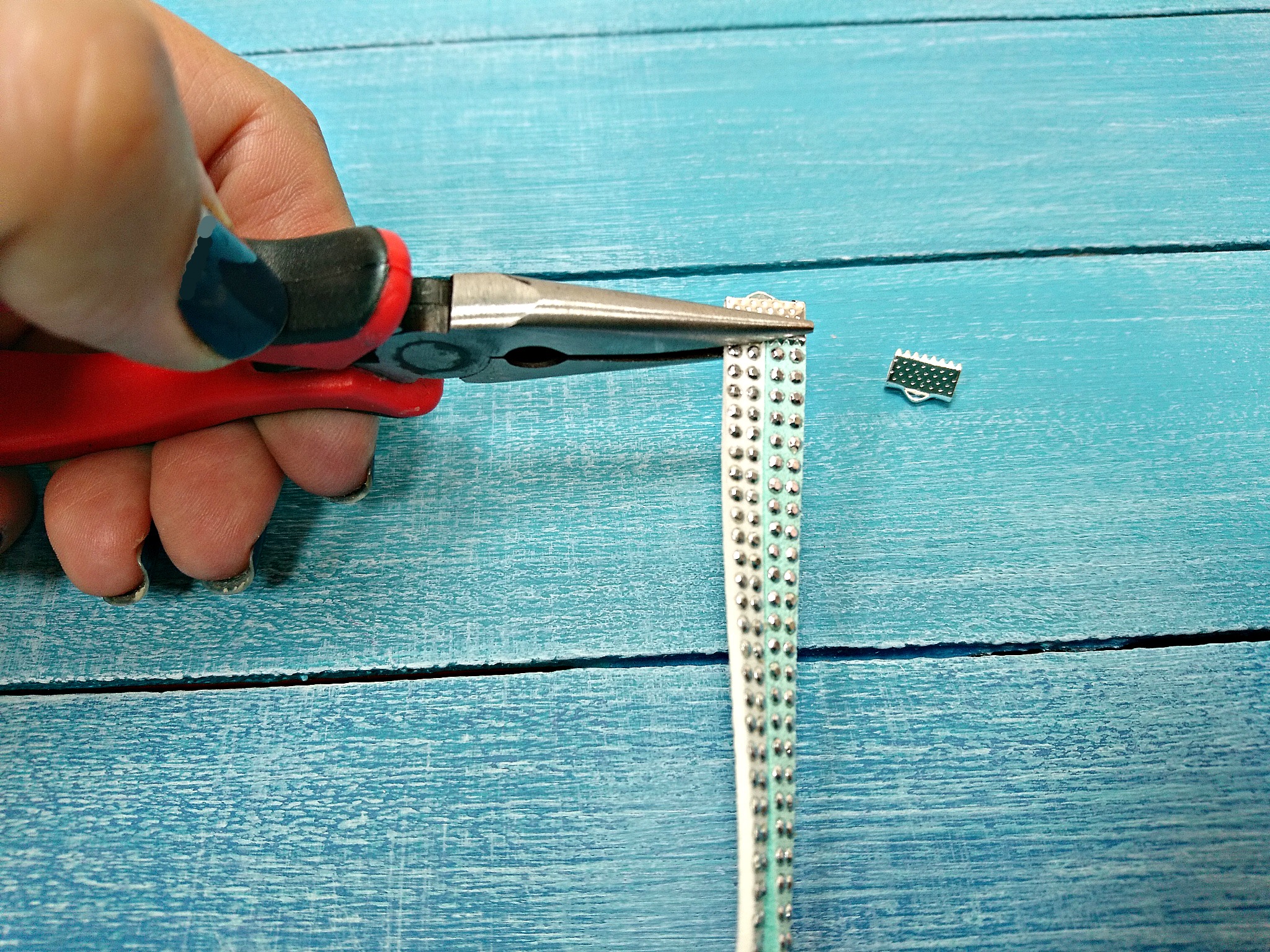 V zaključek za vrvico položimo 4 turkizne povoščene vrvice in zaključek stisnemo najprej z ene, potem pa še z druge strani.