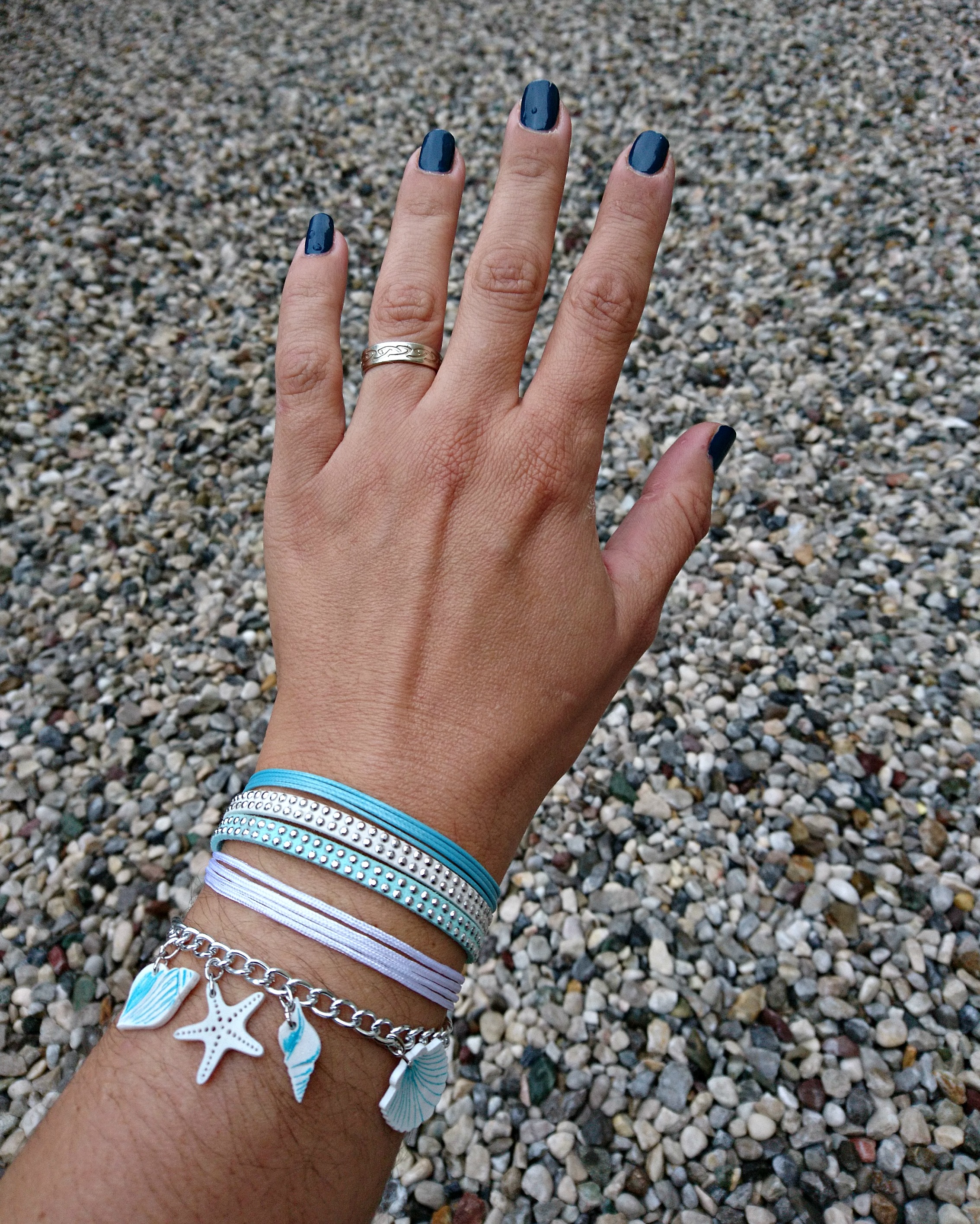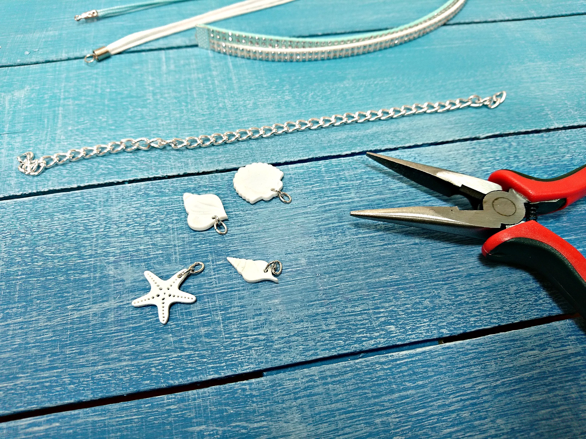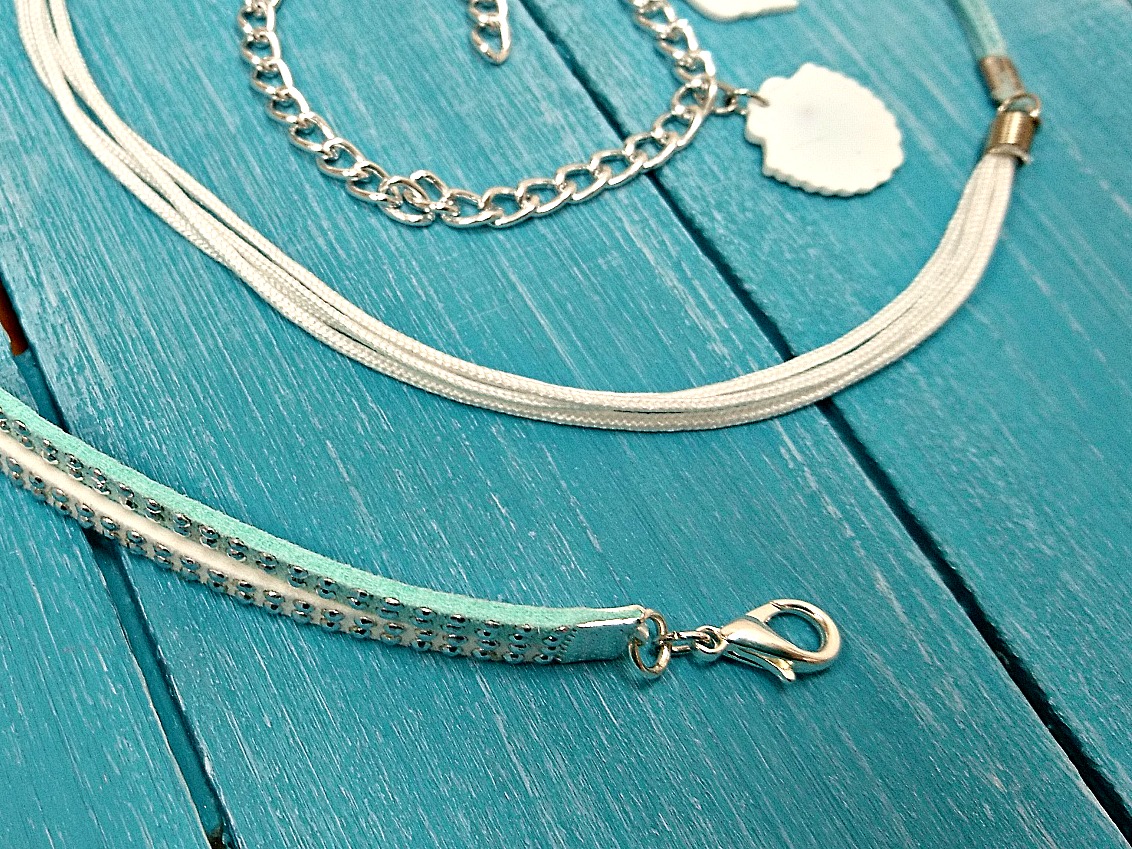 Na školjke namestimo po dva mala obročka in jih kot obeske namestimo na aluminijasto verižico.