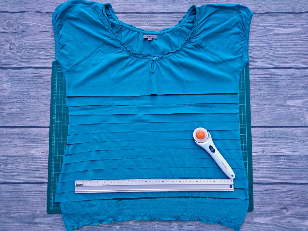 Majico razrežemo na 2 do največ 2,5 cm široke trakove. Če ima majica stranske šive, le-te odrežemo stran.