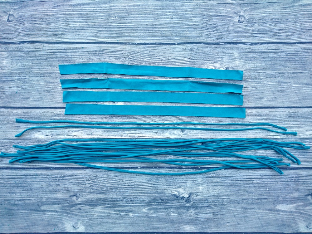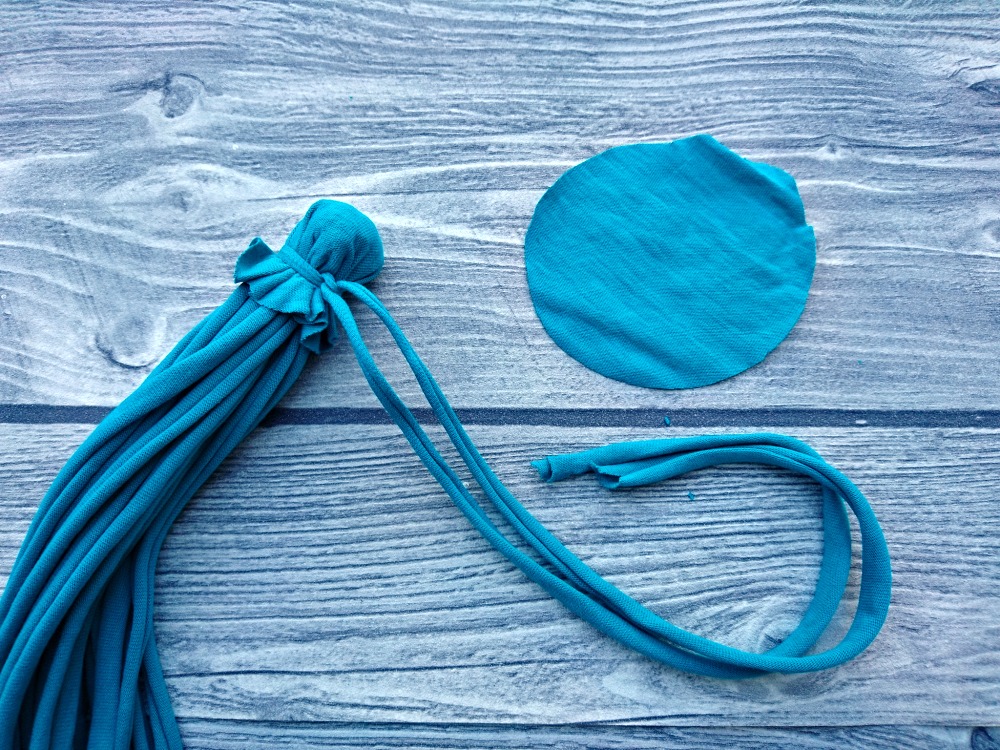 Naa levi strani vrvice odrežemo v navpični liniji. Pripravimo si še dve krajši in dve daljši vrvici, iz rokavov pa izrežemo dva kroga.