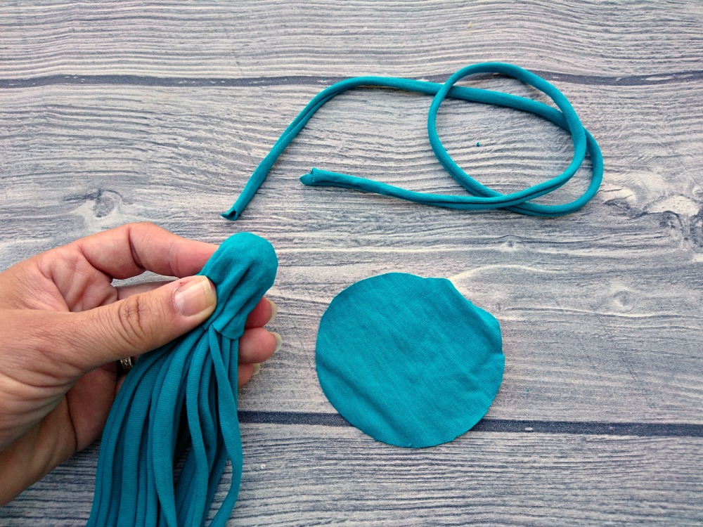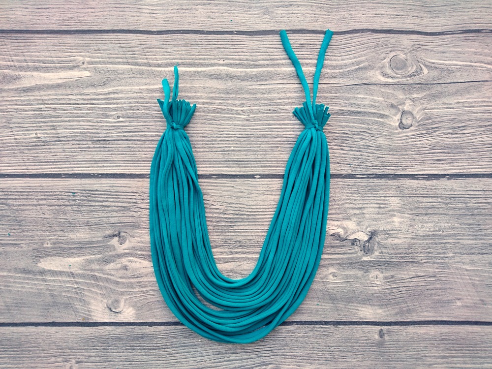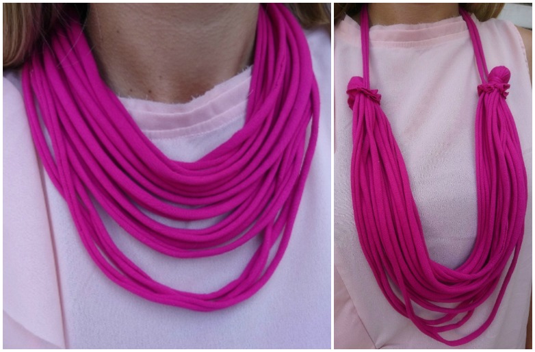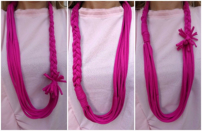 Iz starih bombažnih majic ali iz reklamnih majic, na katerih nam ni všeč logotip, lahko izdelamo zanimiv nakit. Za osnovno delo so dovolj škarje, rezanje pa si lahko olajšamo z uporabo rezalne plošče in krožnega rezila.Potrebujemo: