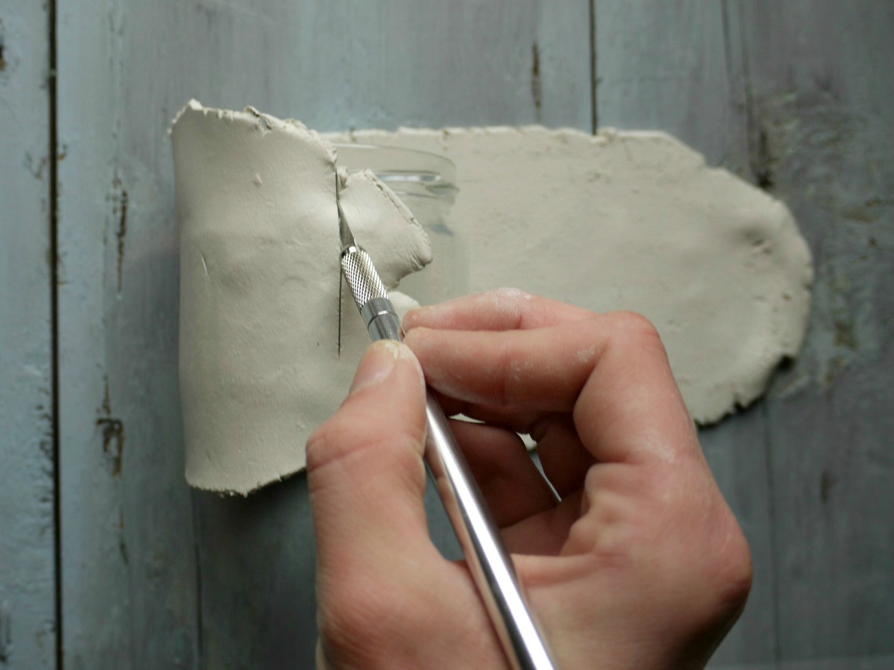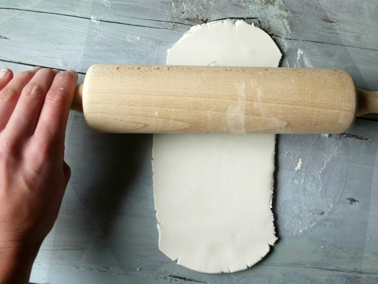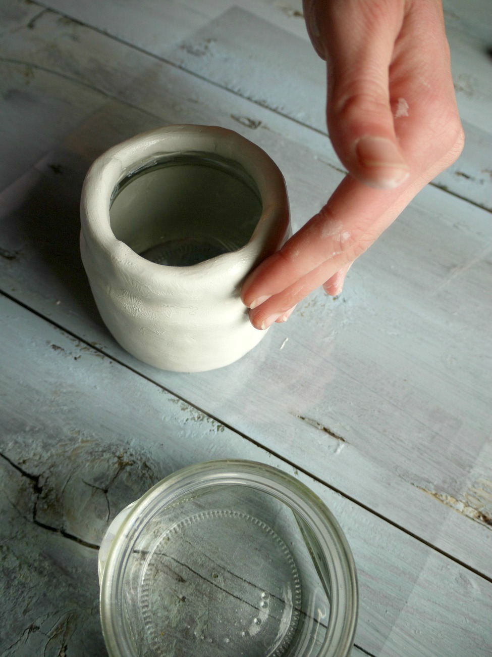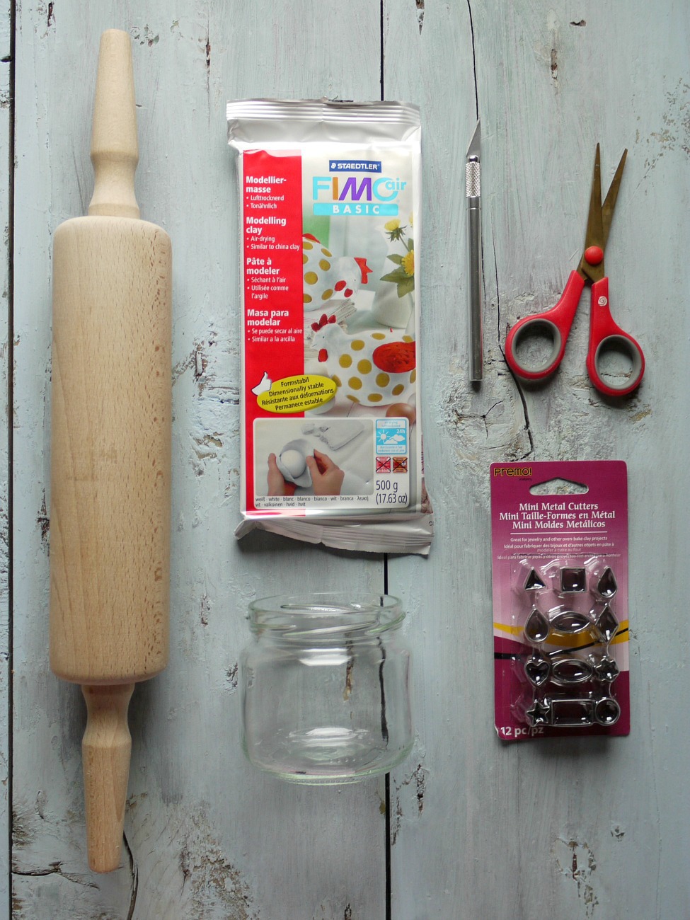 Potrebujemo steklen kozarec, na zraku sušečo modelirno maso Fimo Air, Premo Sculpey mini izsekovalce, lesen valjar in skalpel.