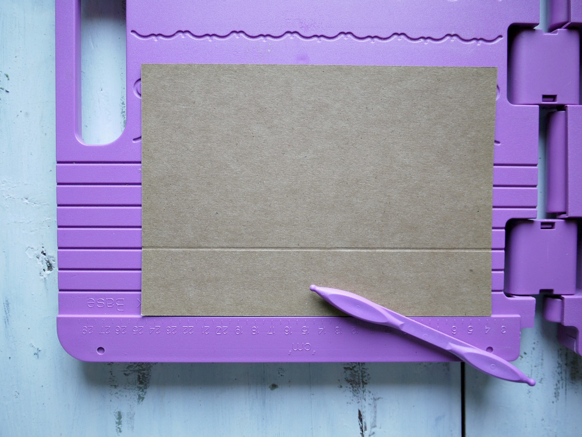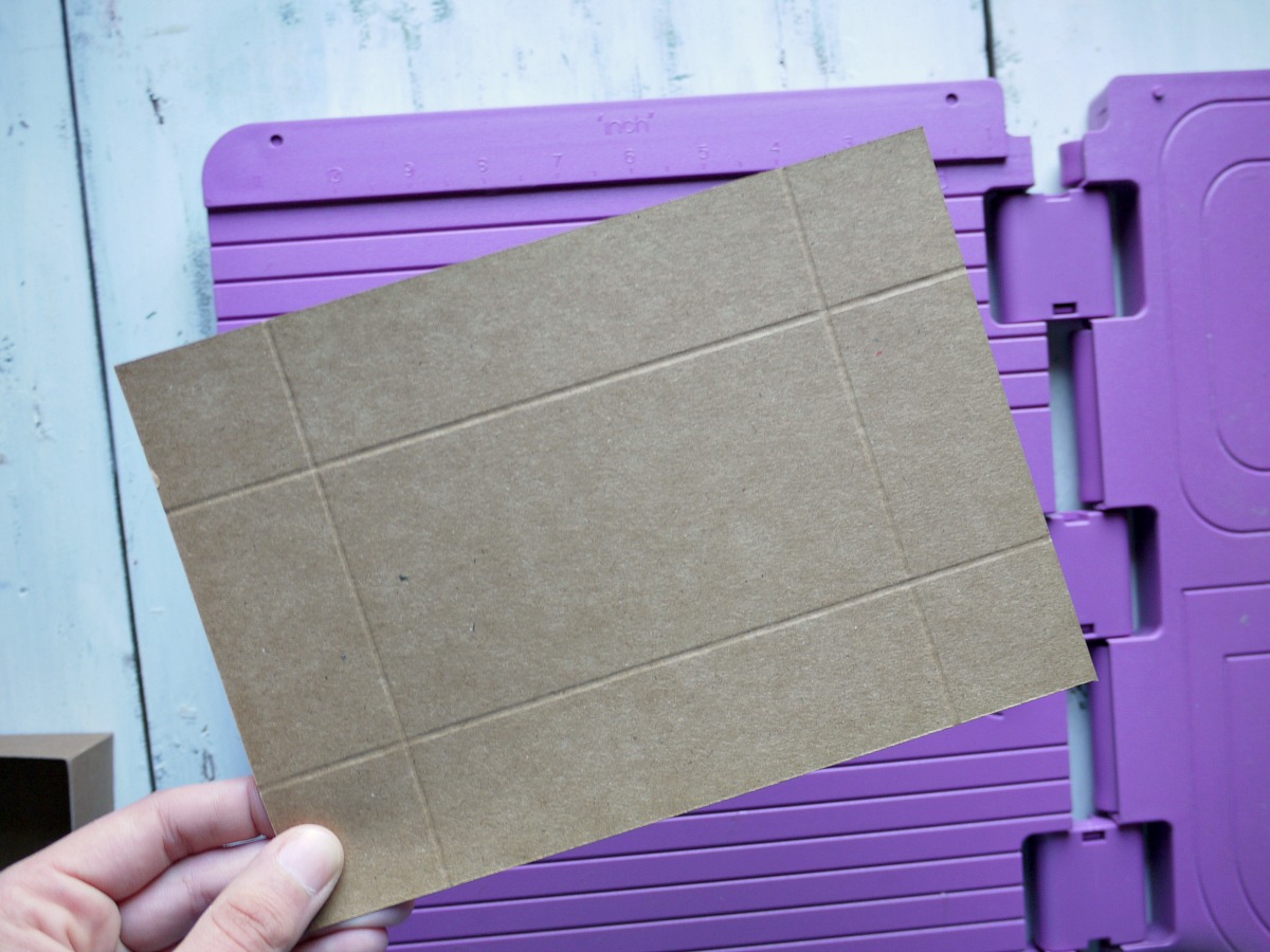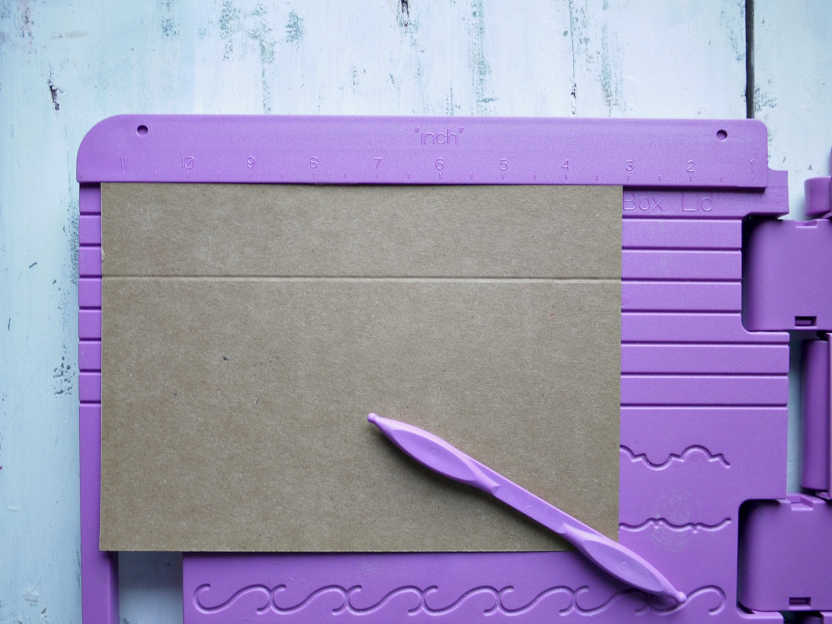 Papir prerežemo na polovico, da dobimo 2 x A5 format in nato z Ultimate Pro ploščo za izdelovanje škatel naredimo prepogibe. Osnovo oz. spodnji del škatlice naredimo na strani, kjer je napisano - Box Base.