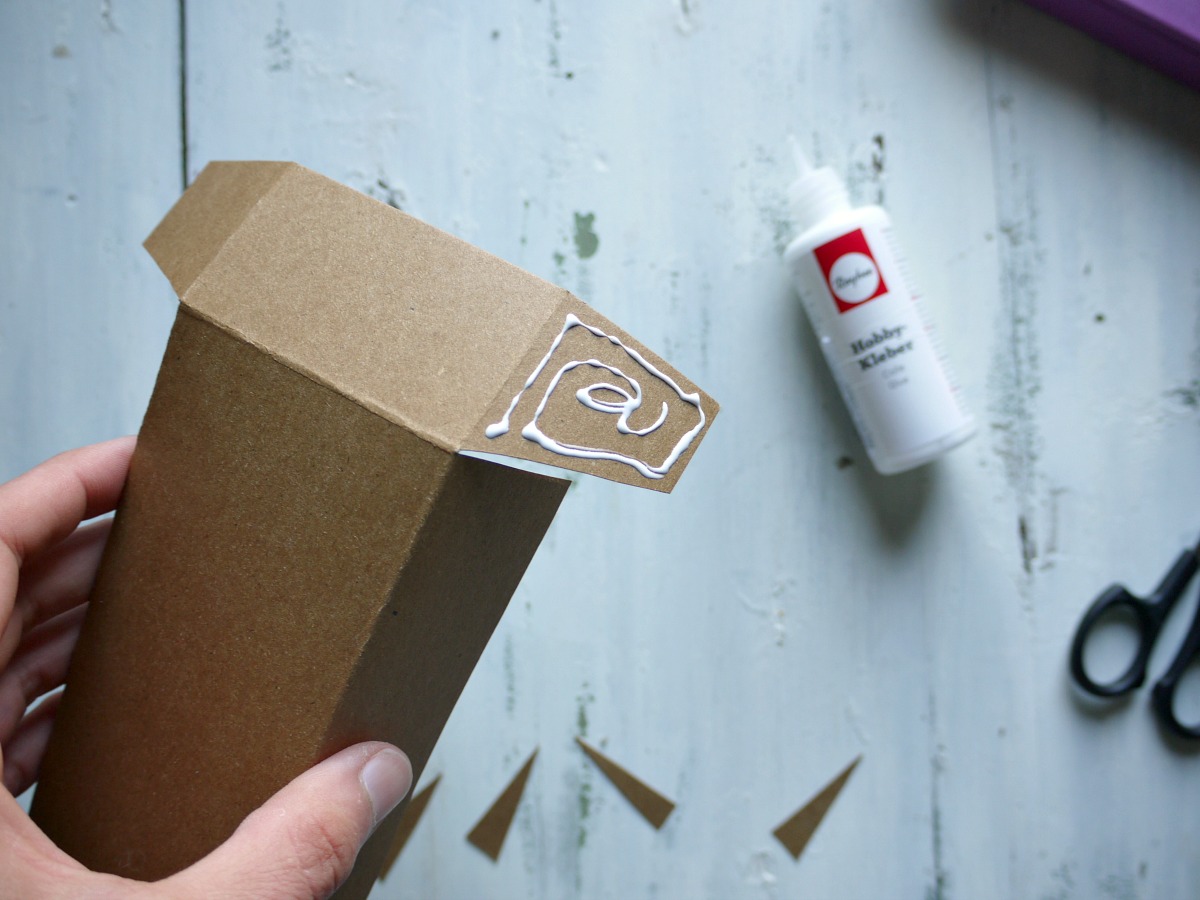 Zopet zarežemo zavihke. Dva zavihka zalepimo kot pri osnovnem delu škatlice.