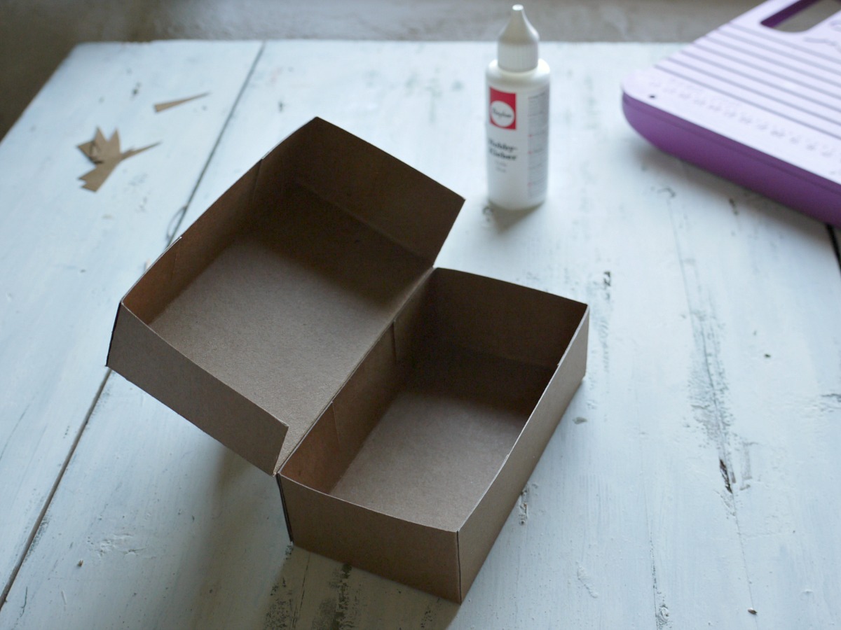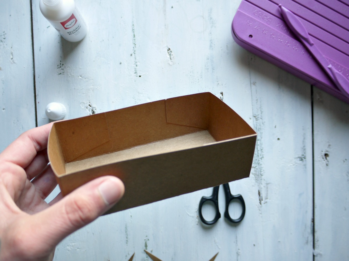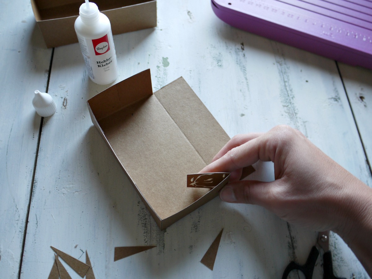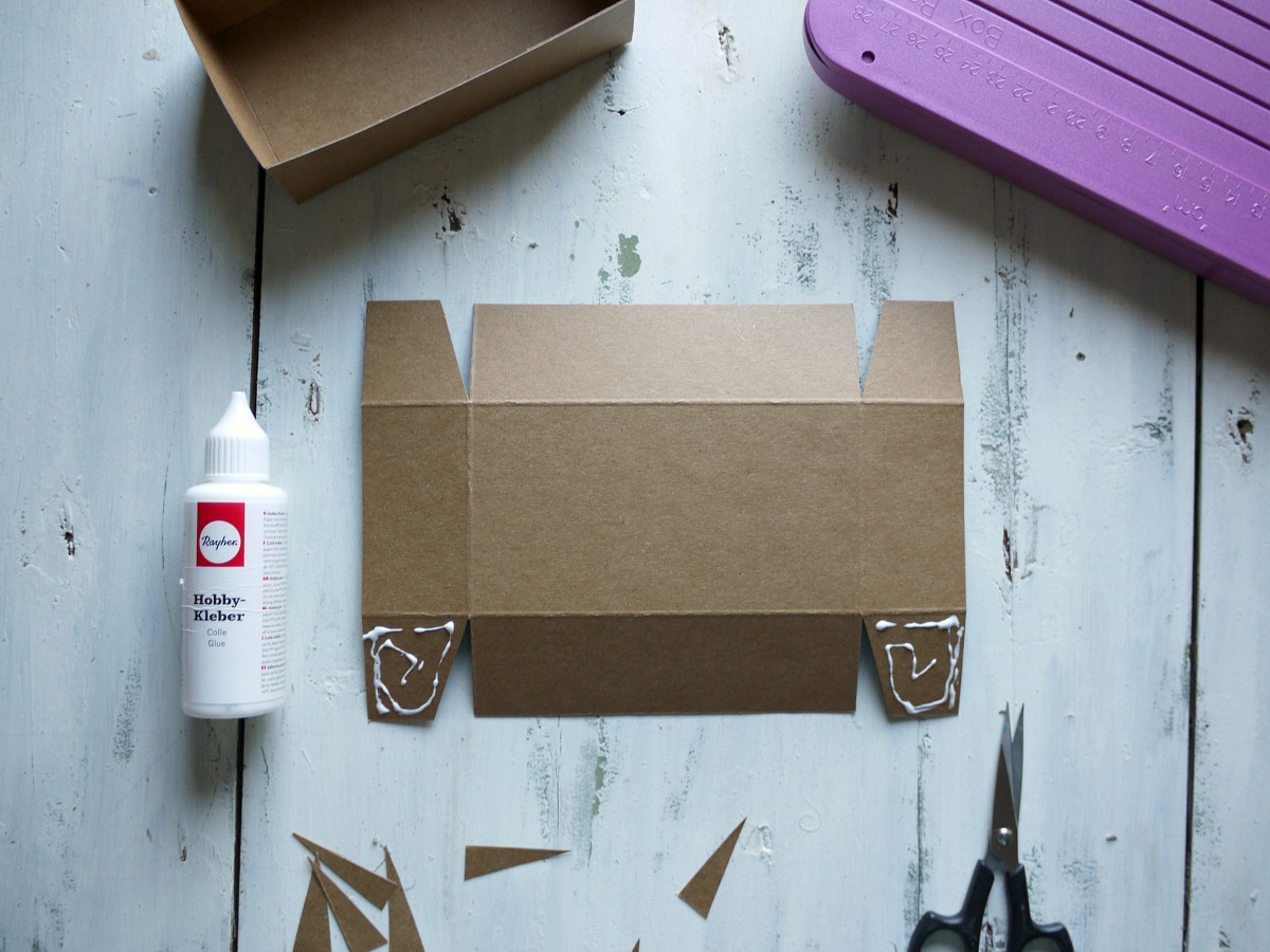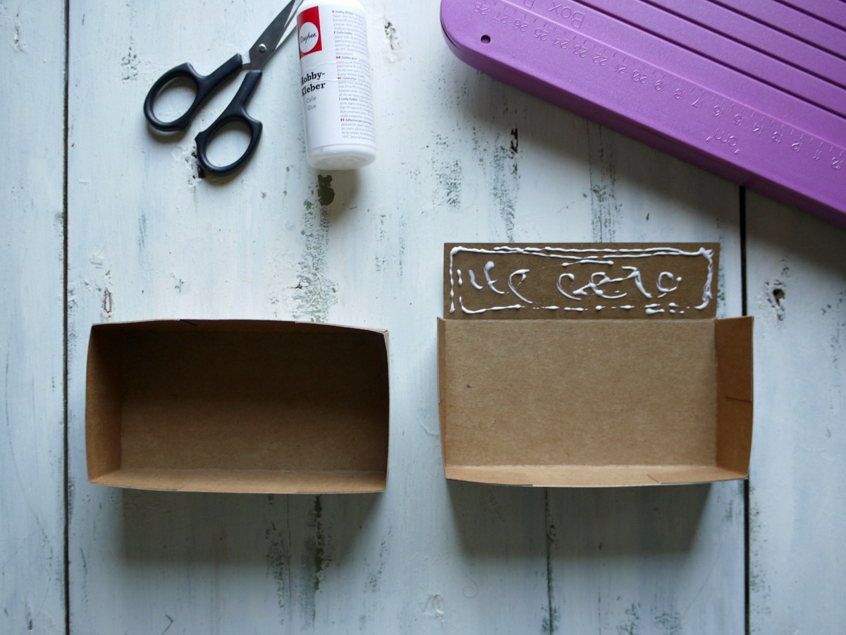 Daljšo stranico zalepimo na osnovo škatlice tako, da se odpira s strani.