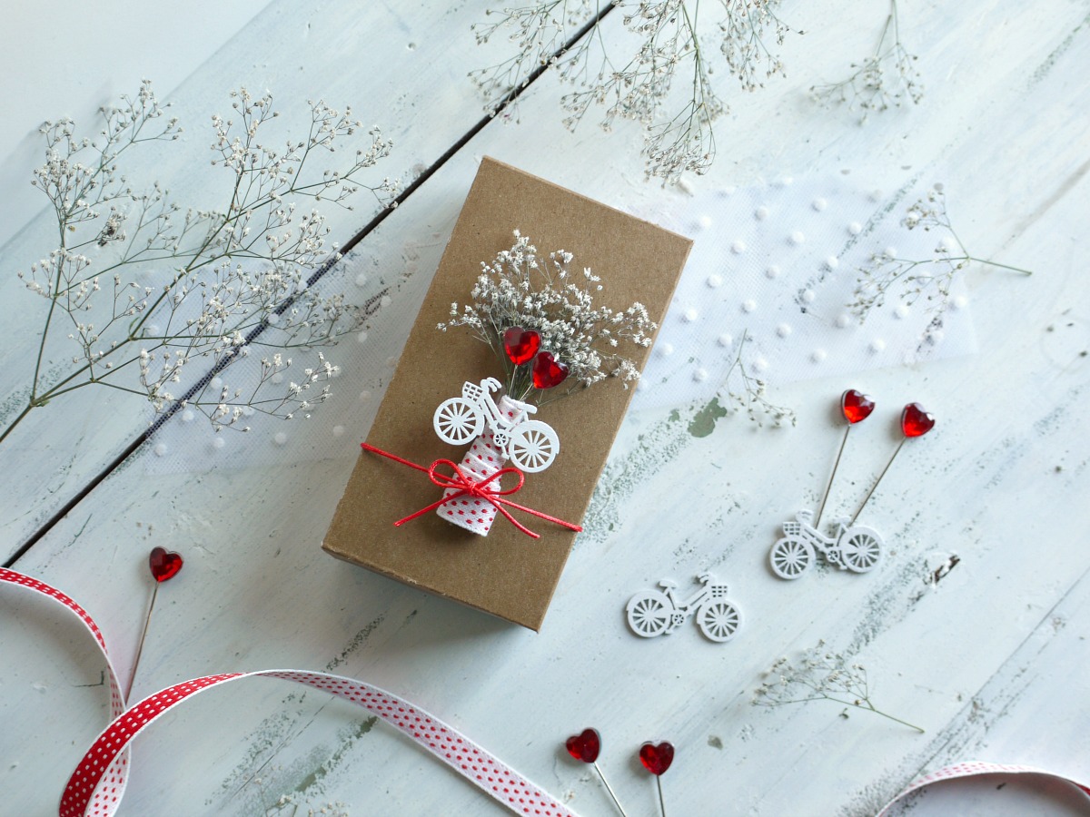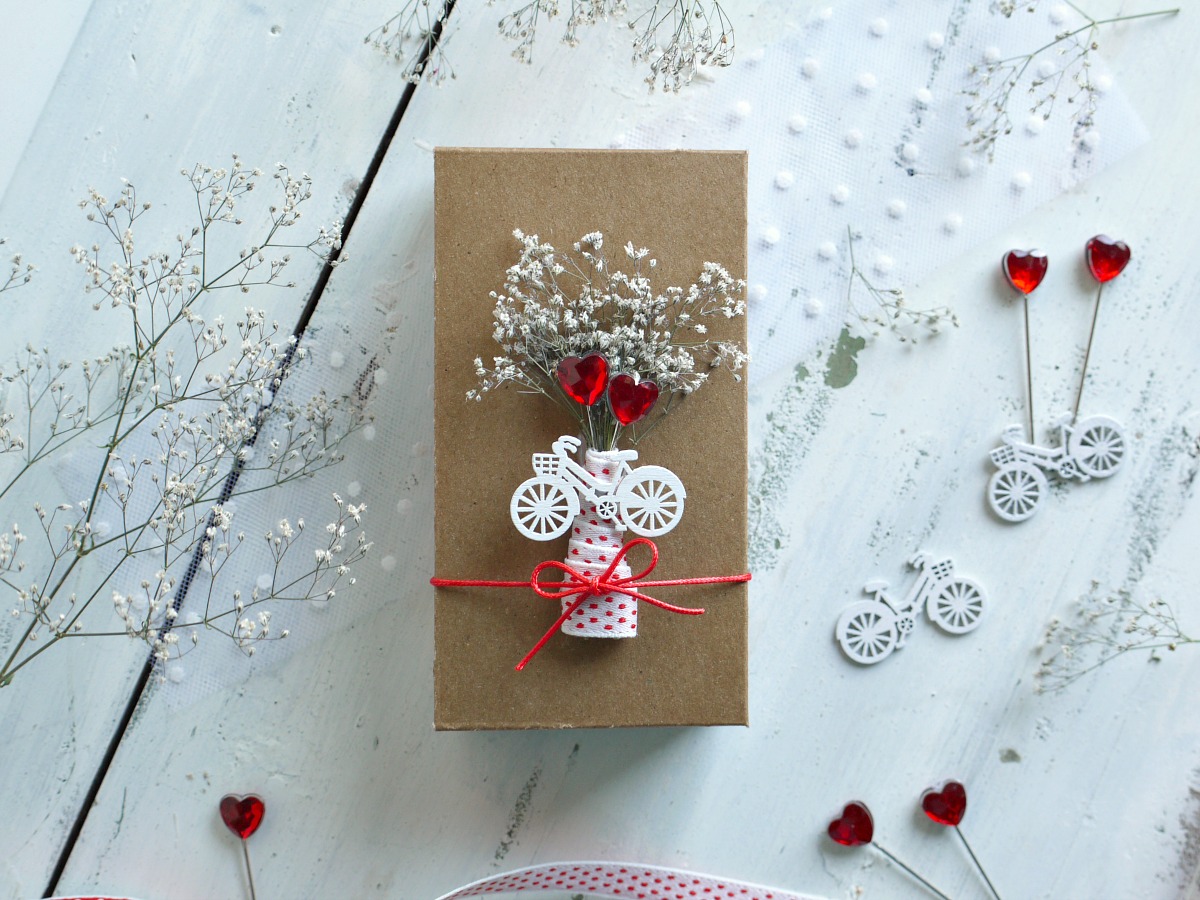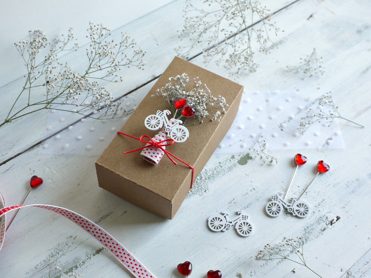 Darilna škatlica je narejena in za piko na i smo zavezali še mini rdečo pentljico.