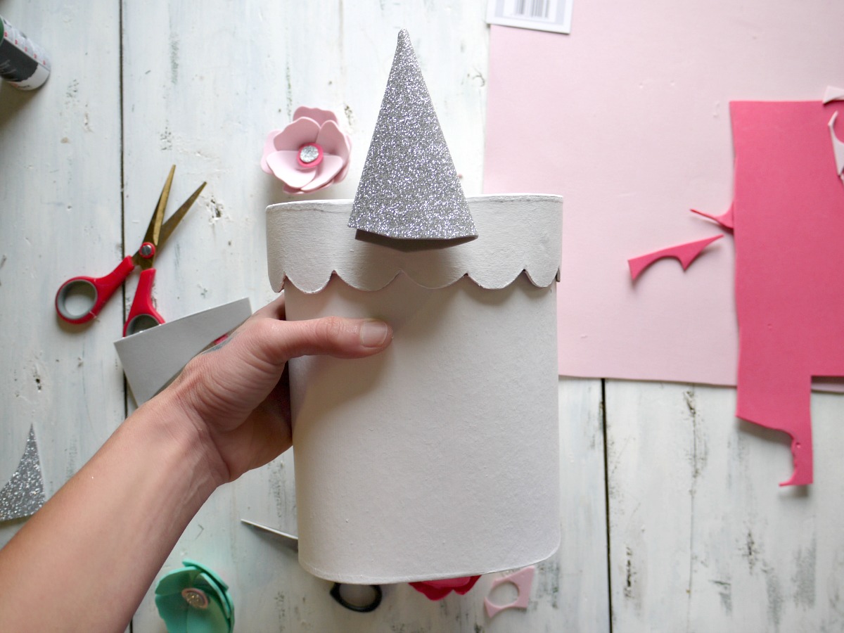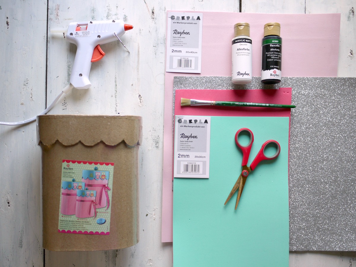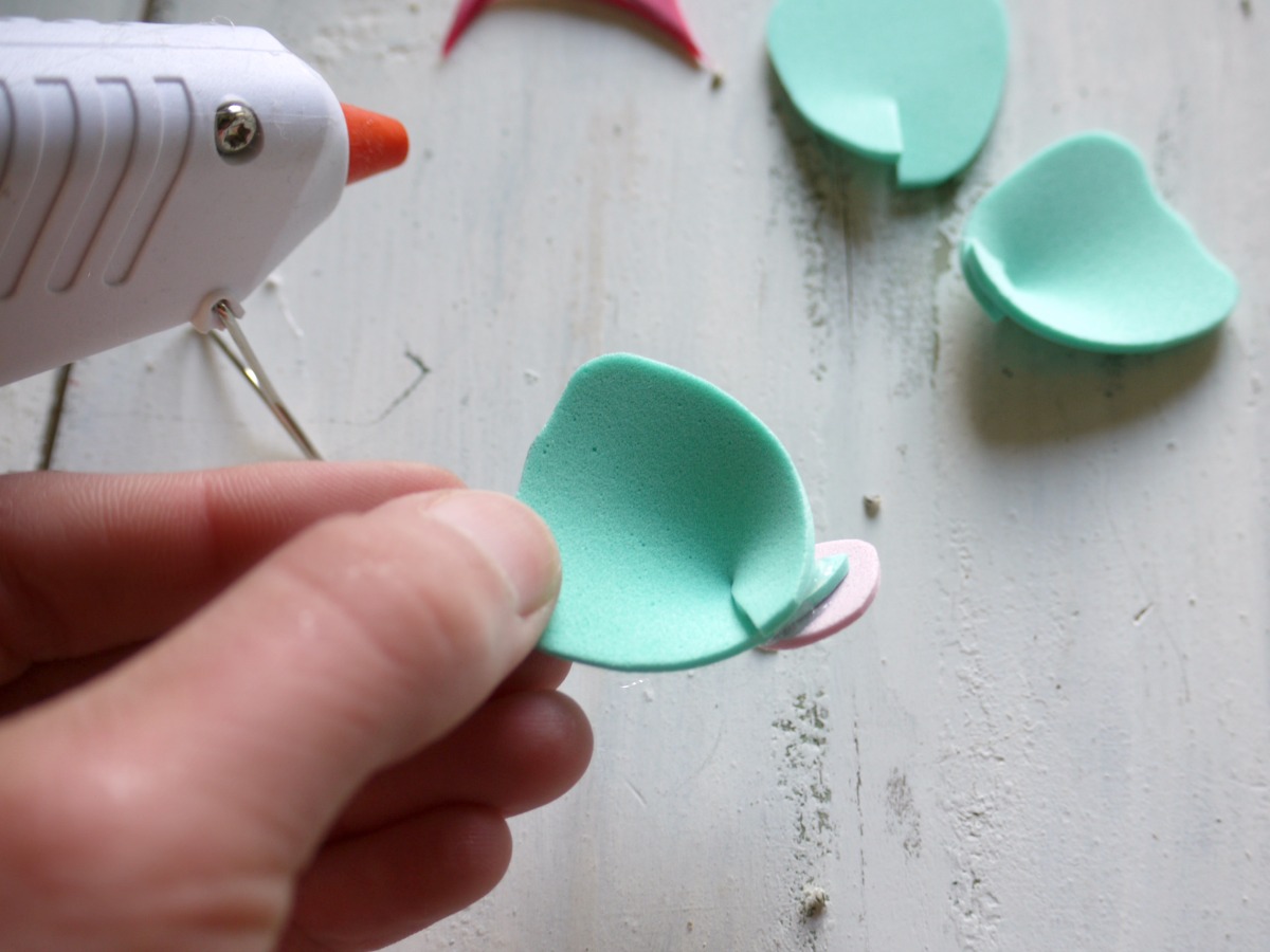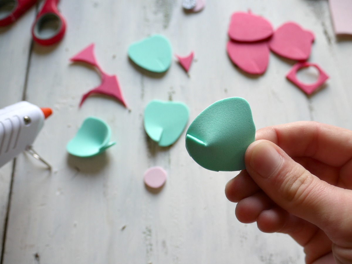 Iz penaste gume izrežemo in oblikujemo cvetove, rog in ušesa. Nato jih z lepilno pištolo nalepimo na pokrov škatle.