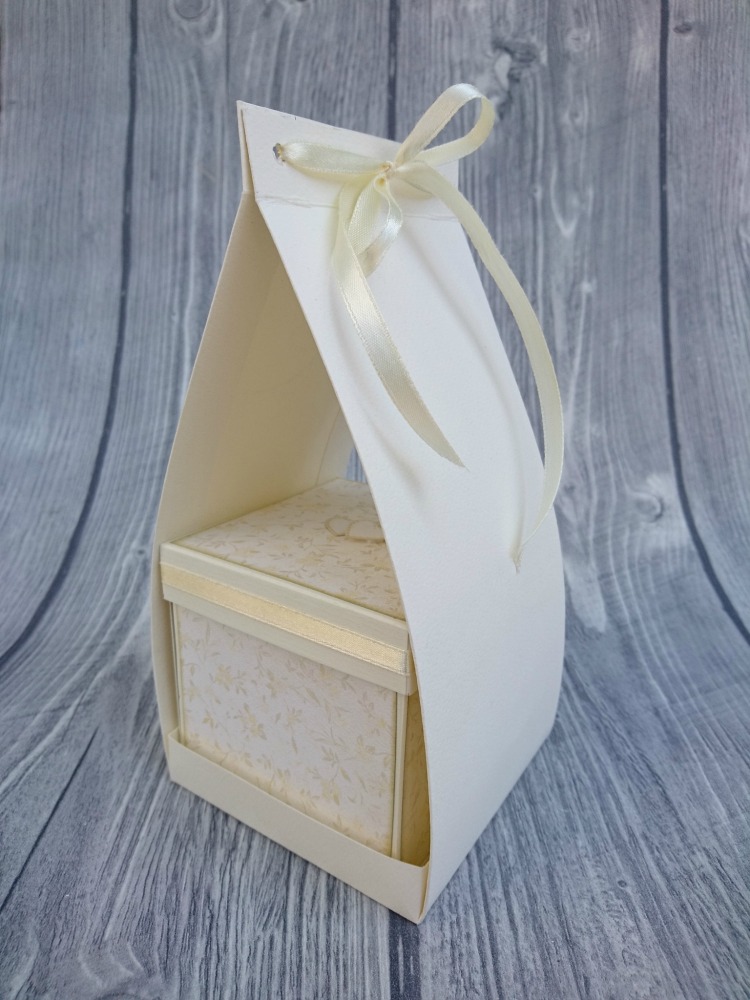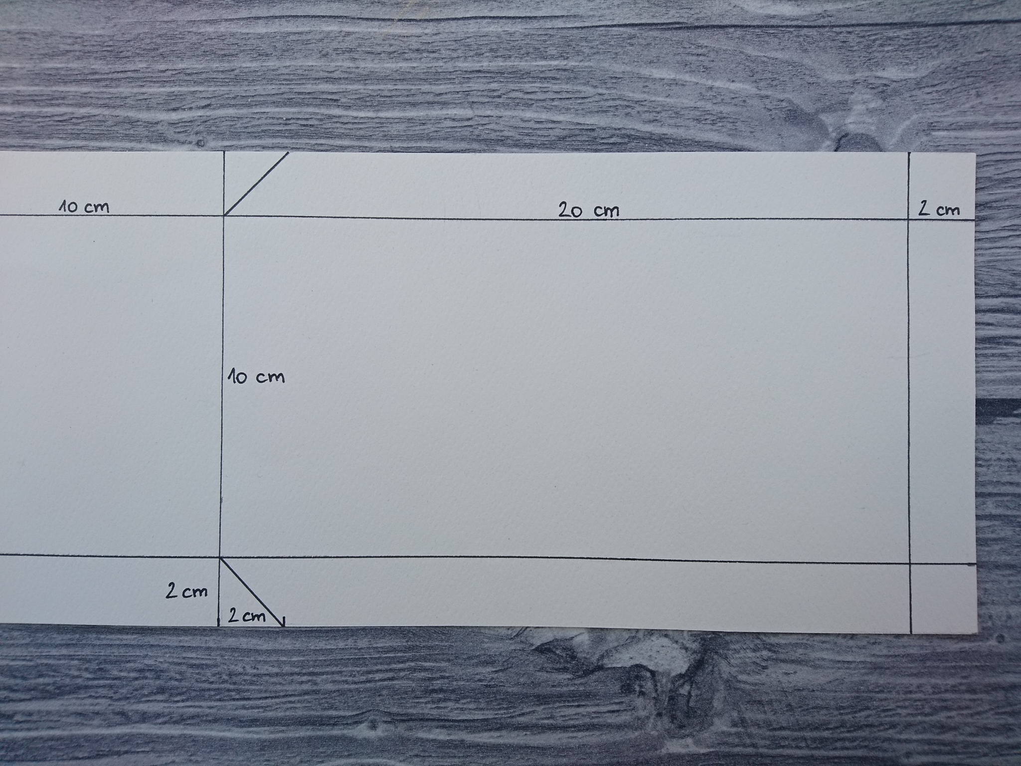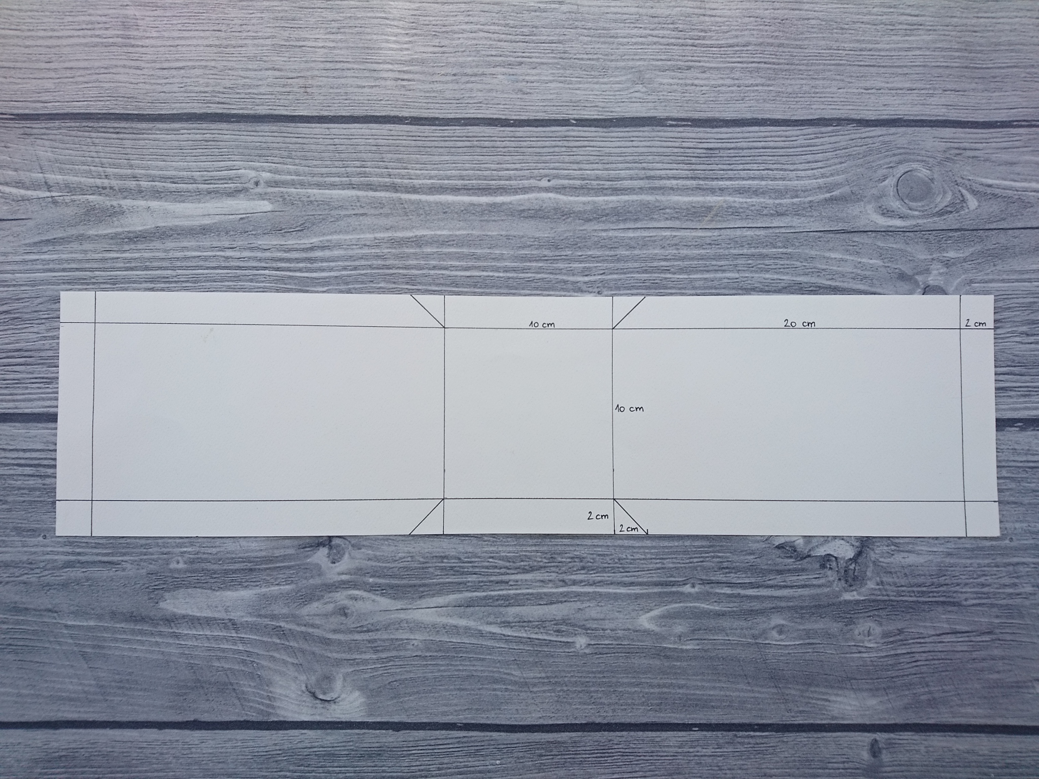 Ker ima škatlica mere 9×9×9 cm, smo se odločili za višino embalaže 20 cm, na vsaki stranici pa smo dodali še 2 cm za zavihek, skozi katerega napeljemo satenast trak za zavezovanje.