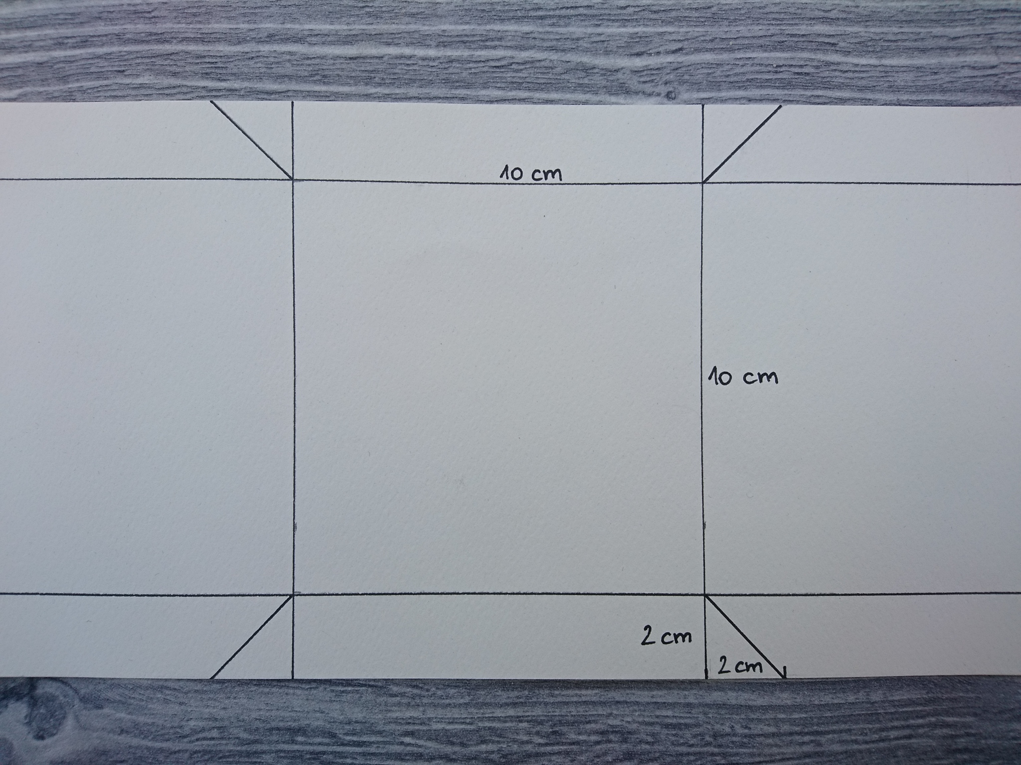 Navodila so pripravljena za izdelavo embalaže, v katero pospravimo škatlico s stranicami 9 cm.Če imamo škatlico z daljšimi stranicami, osnovni kvadrat embalaže ustrezno povečamo. Dovolj je, da je stranica kvadrata za 1 cm večja od dimenzije škatlice. Dolžina zavihkov naj bo 2 cm daljša od dvakratne dolžine stranice kvadrata. Na vsaki strani dodamo še 2 cm za del, kjer bo napeljan trak.