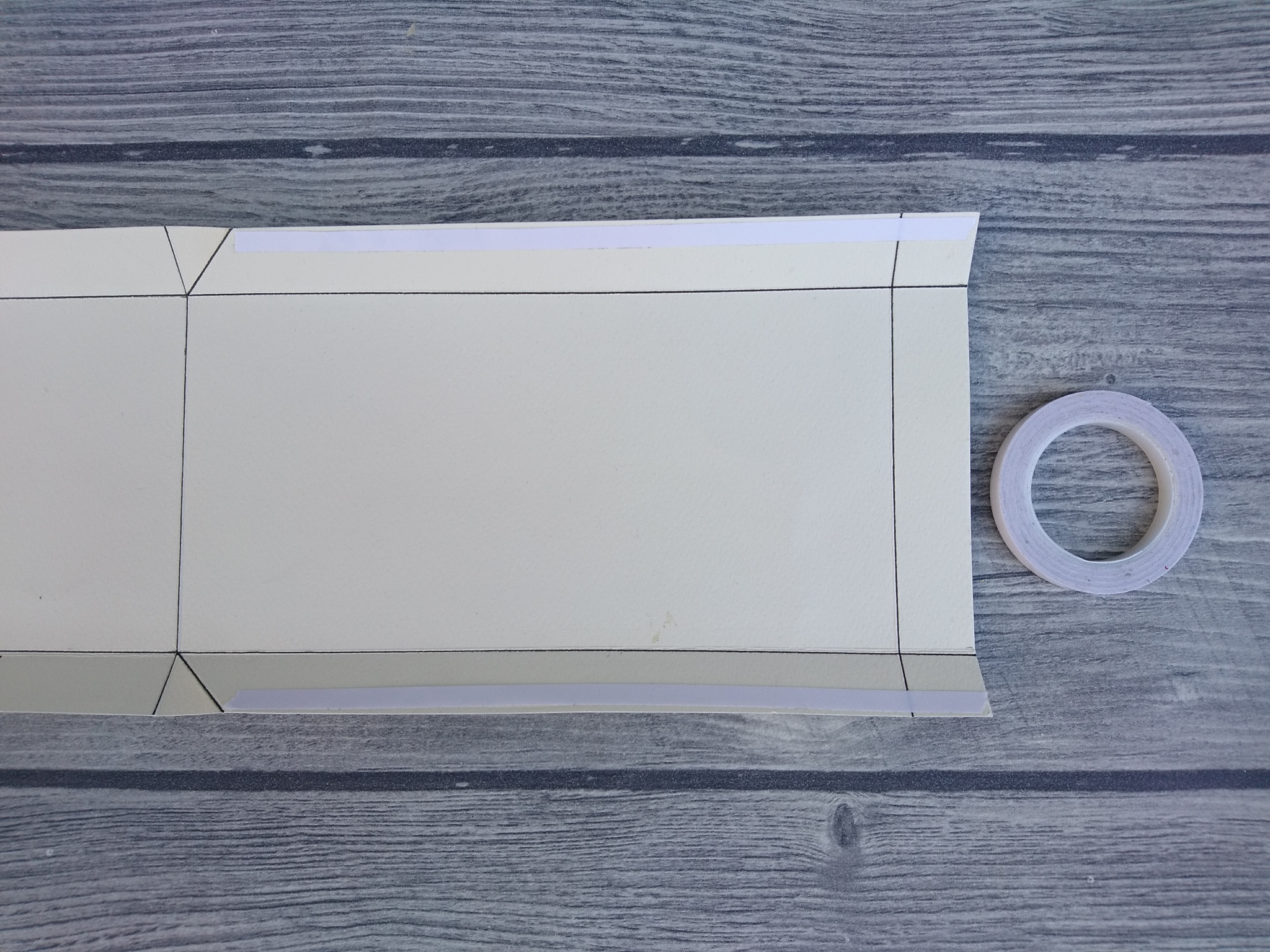 Na robove do diagonalno označenega pregiba zalepimo obojestranski samolepilni trak.