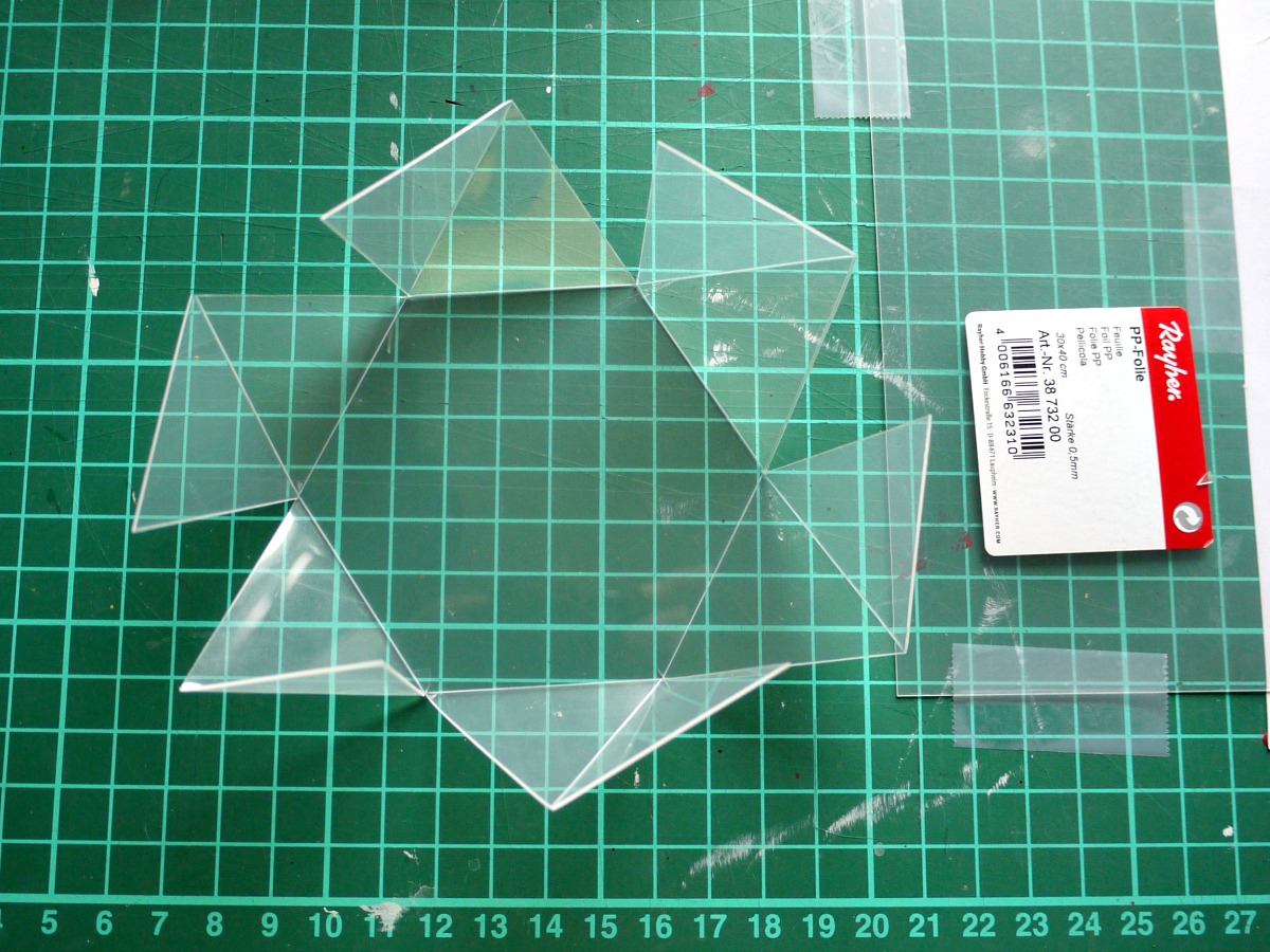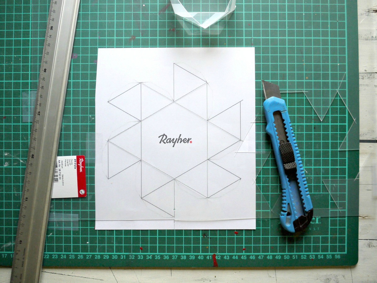Skico za kalup položimo pod folijo. Da se nem osnova za izrez ne bo premikala, papir in folijo ob straneh zalepimo z lepilnim trakom in jo nato izrežemo. Kjer so črtkane črte, naredimo pregib (z olfa nožem zarežemo na rahlo).