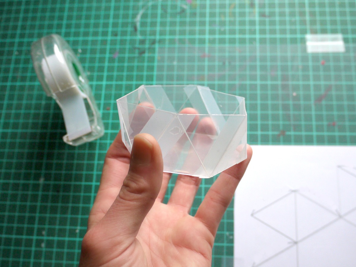 Ko je kalup izrezan, naredimo pregibe in robove ob straneh zalepimo z lepilnim trakom. Tako dobimo 3D obliko posodice.