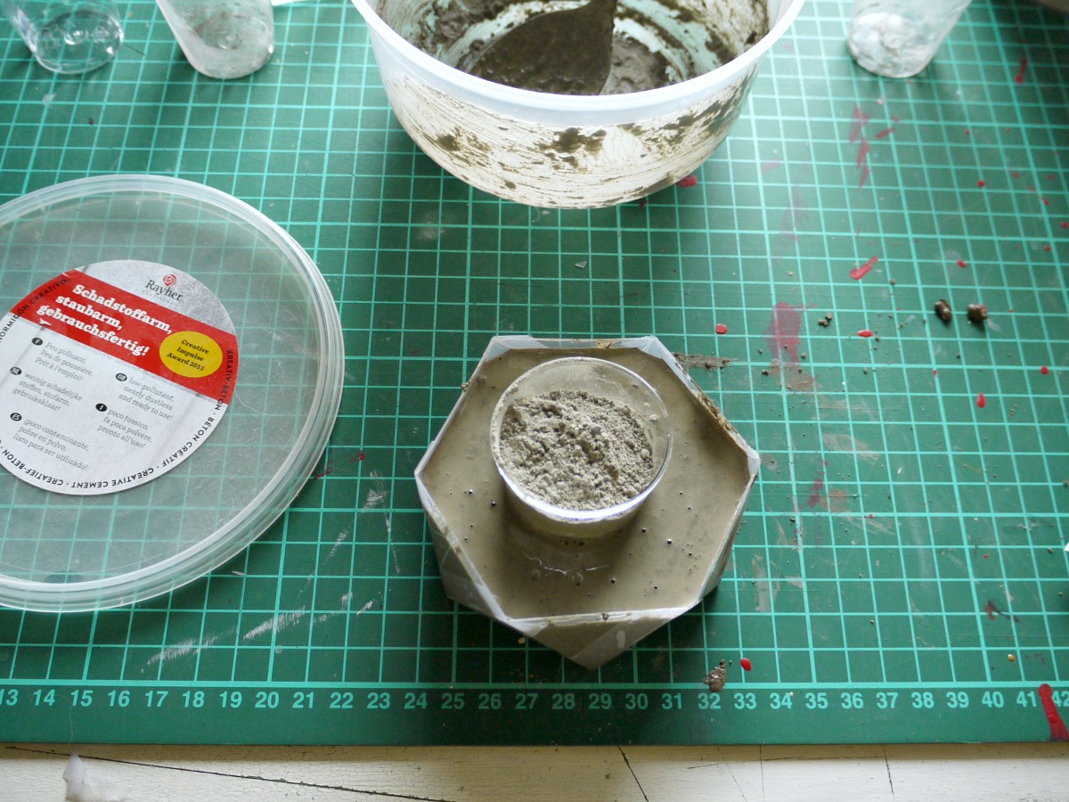 Najprej za približno 0,5 cm napolnimo dno posodice in vanjo na sredino postavimo kozarček, ki je obtežen s peskom. Nato naš kalup do vrha napolnimo s cementom.