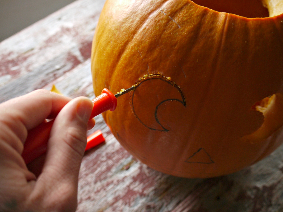 Želen motiv si lahko narišemo na bučo in naredimo obris z označevalnim kolescem ali točkalom.