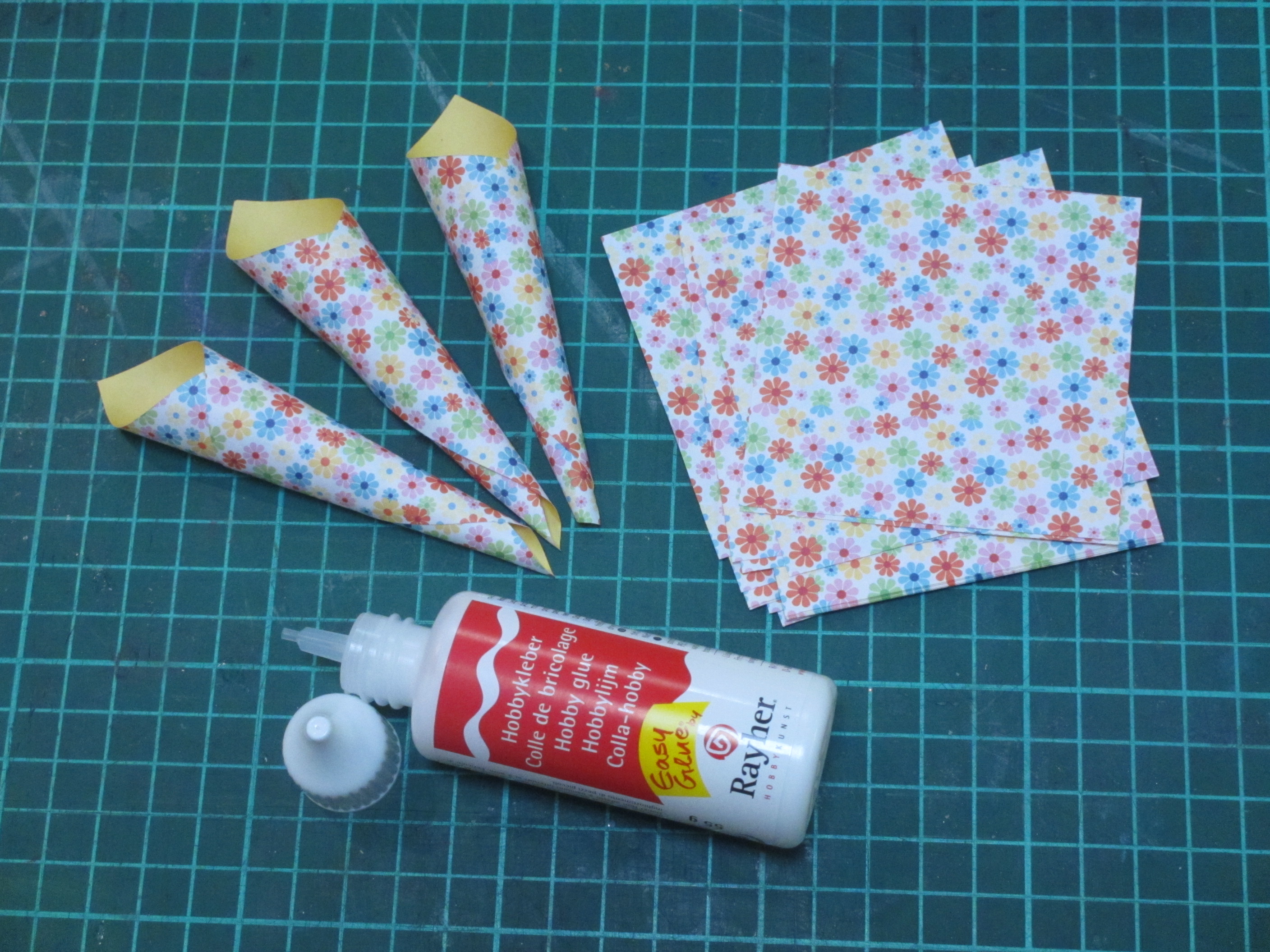 Vsak papirček zvijemo v obliko korneta in zalepimo z lepilom za papir.