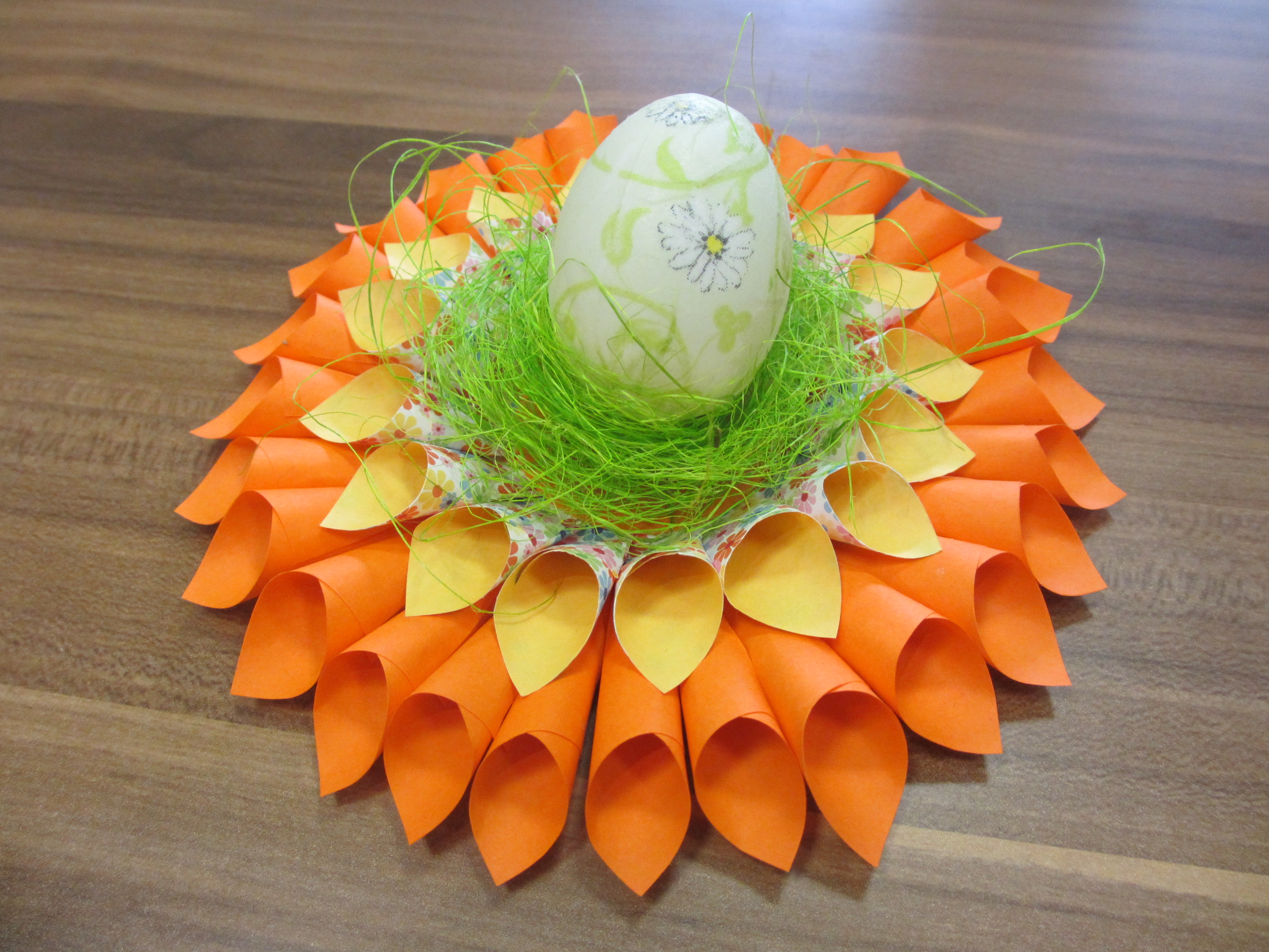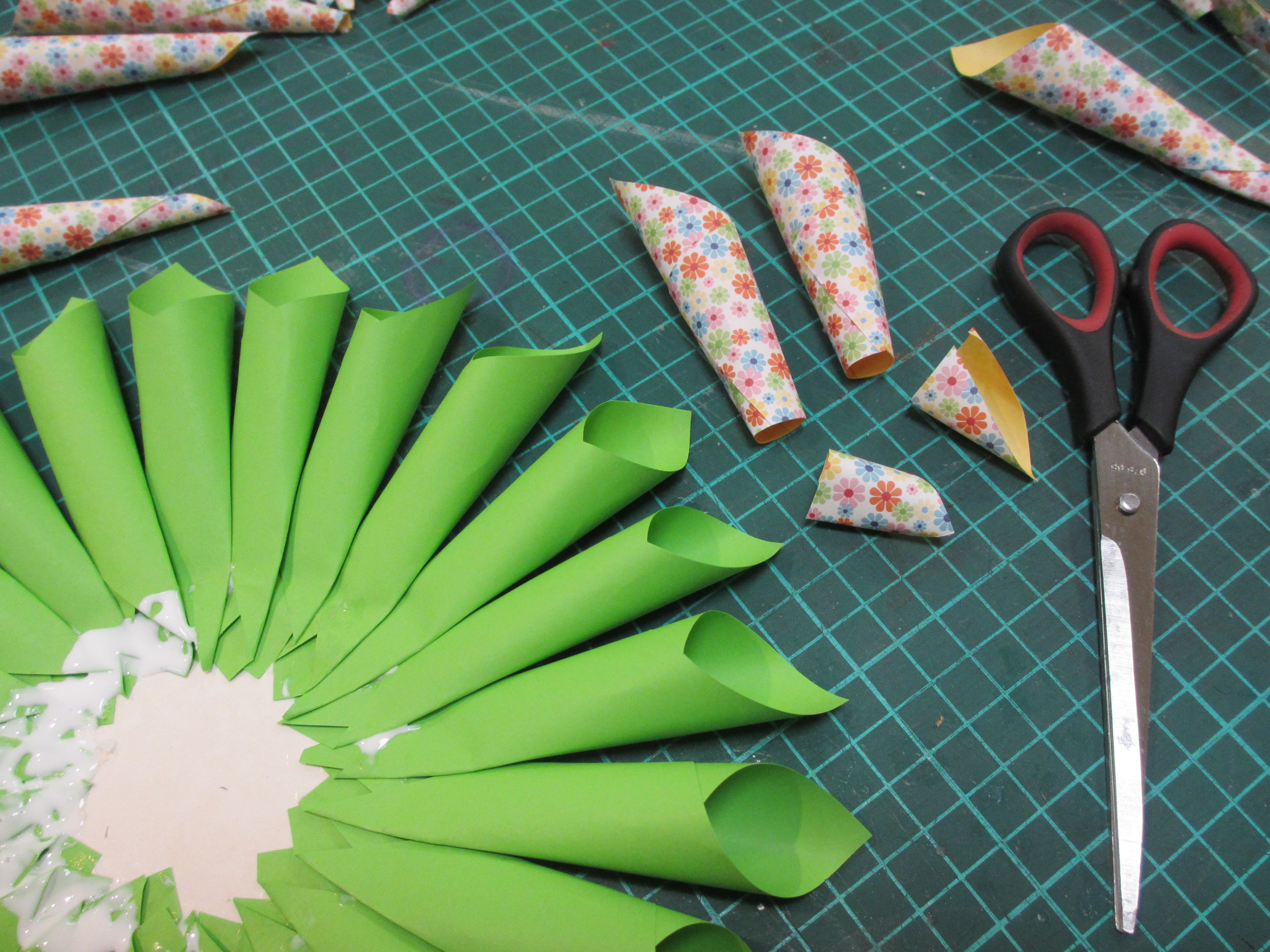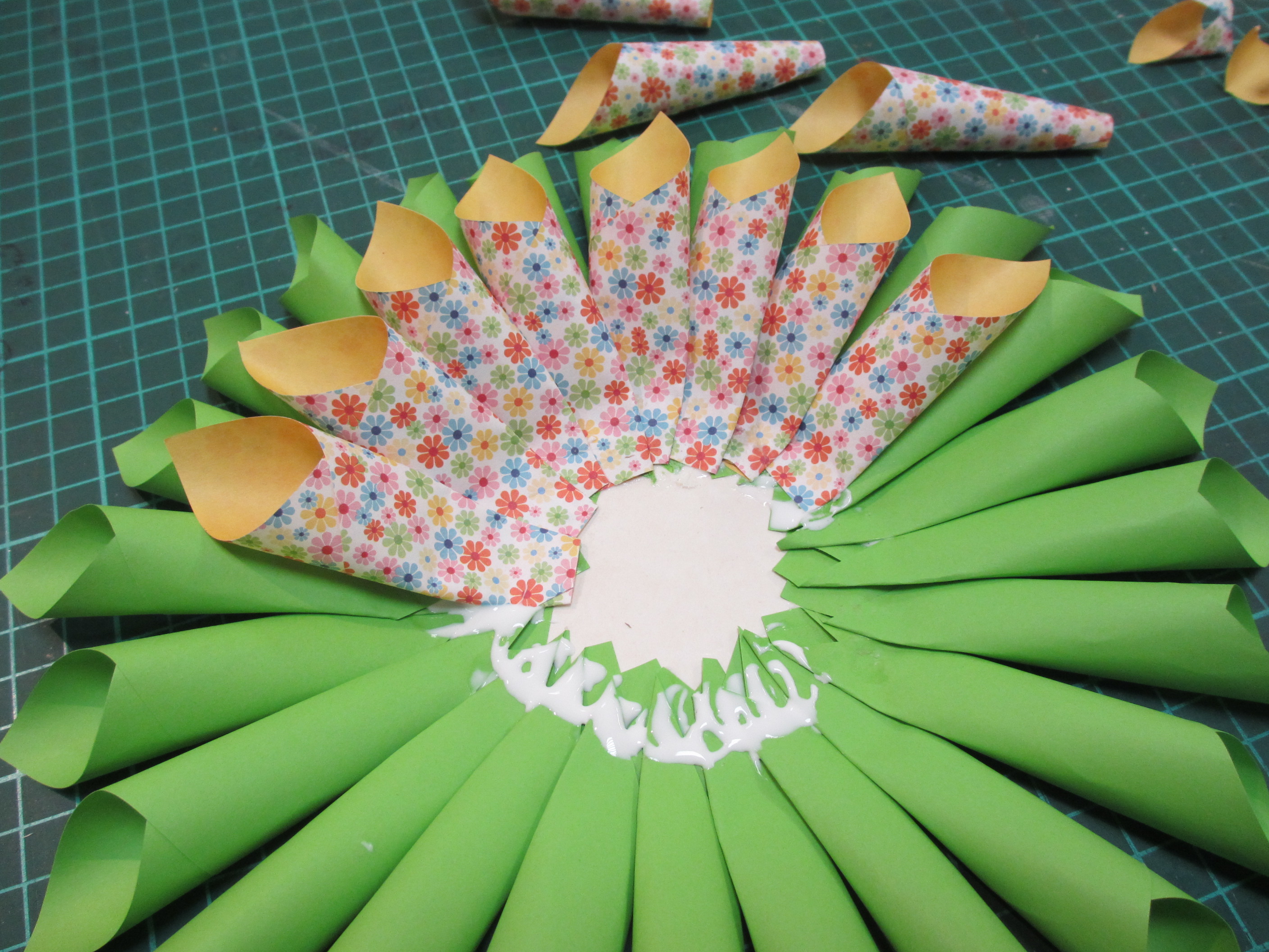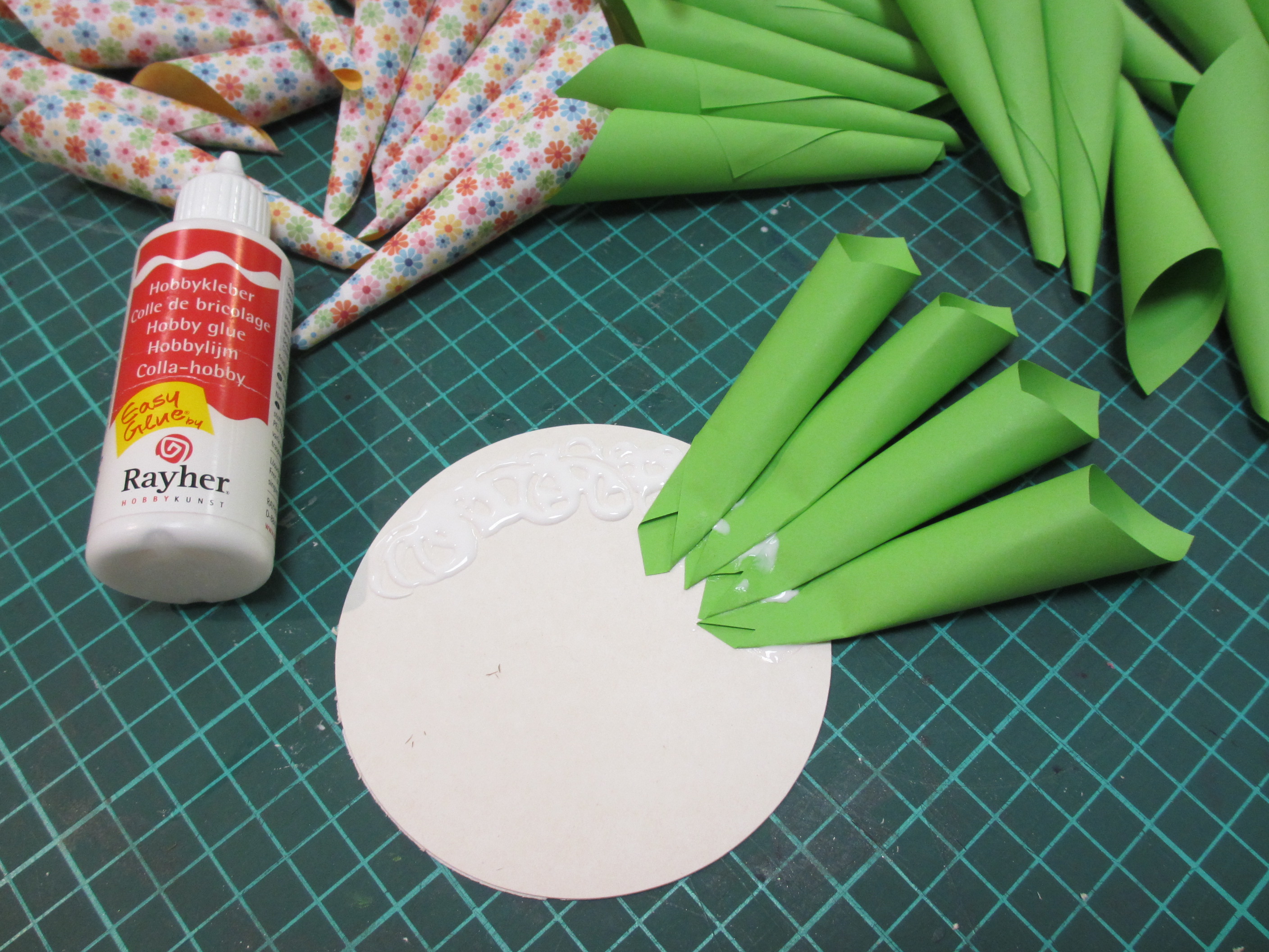 Iz kartona izrežemo krog s premerom 10 cm. Za zunanji obod naredimo 24 kornetov, za notranjega pa kakšnega manj. Kornete nalepimo enega ob drugega.