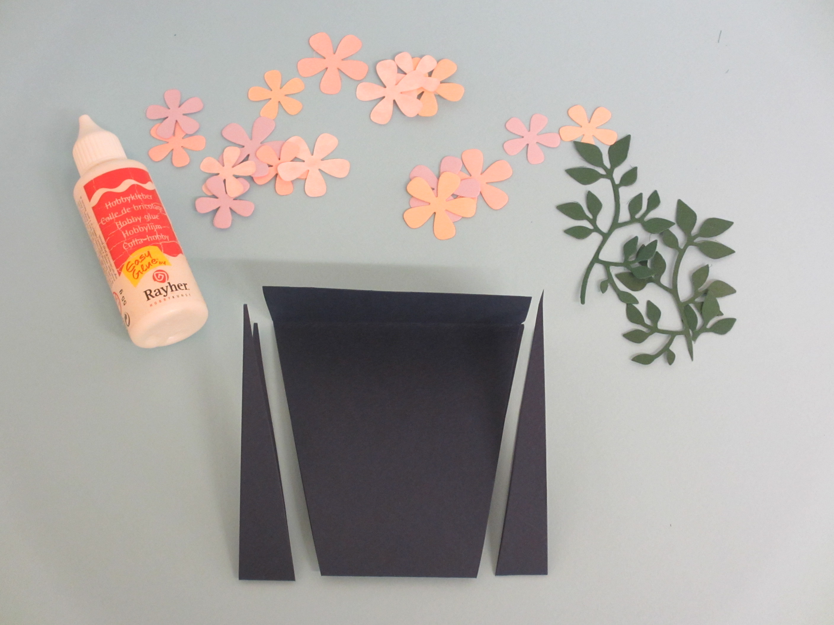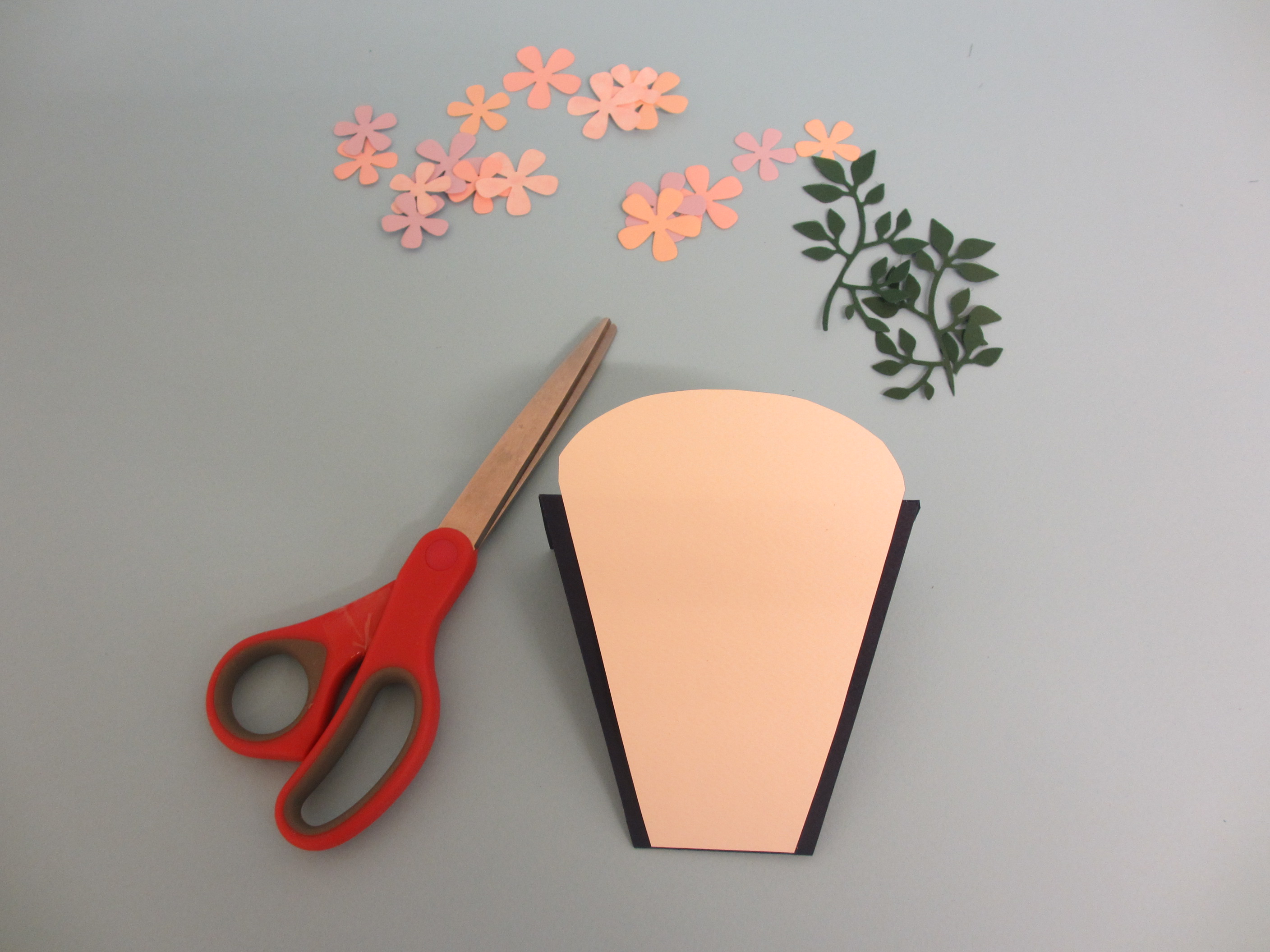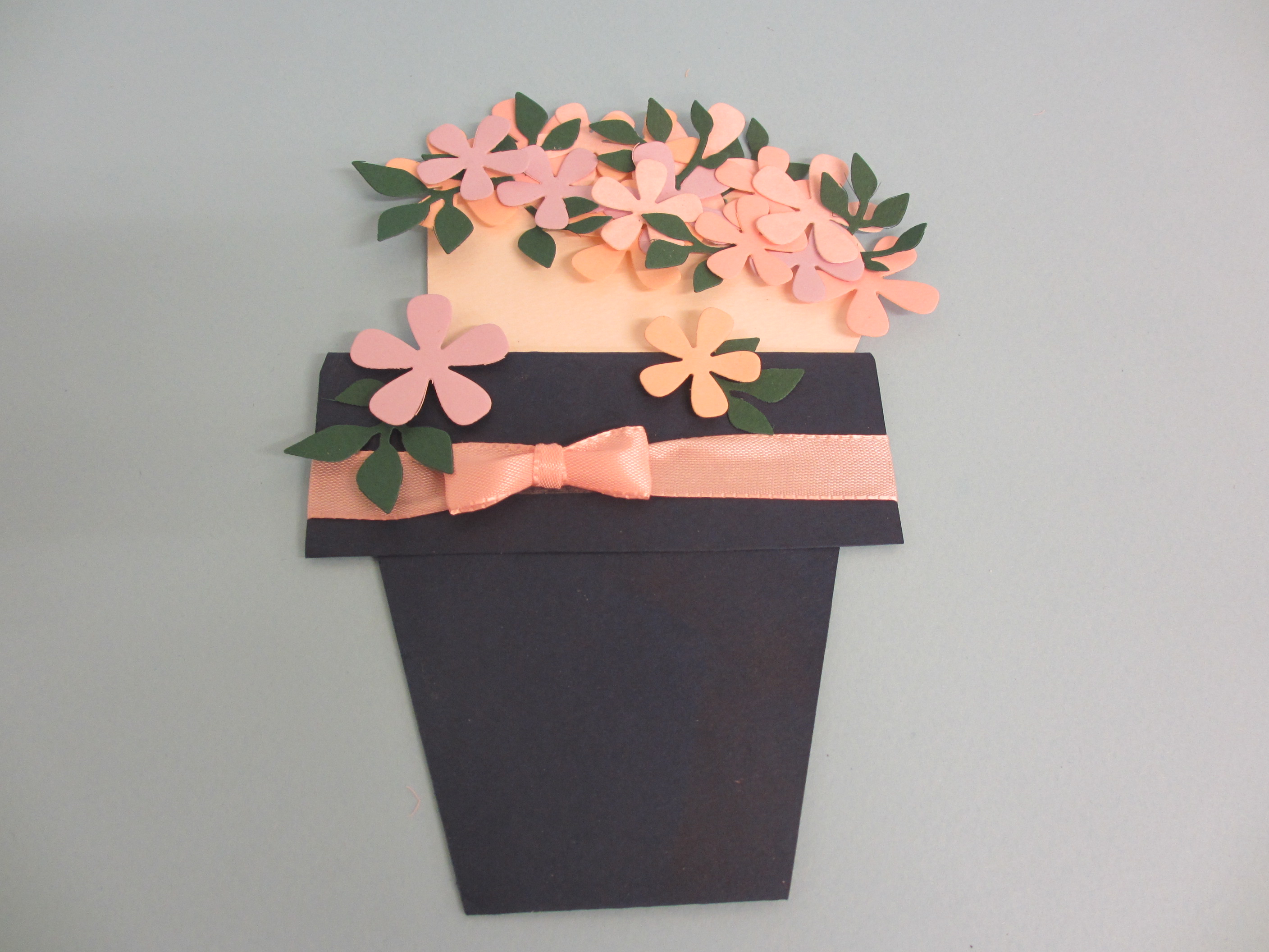 I fiori e le foglie vengono tagliati con il Sizzix Big Shot, ma possiamo anche usare i puncher, fiori di carta già ritagliati, fiori di seta... La base del vaso è piegata come nella foto.