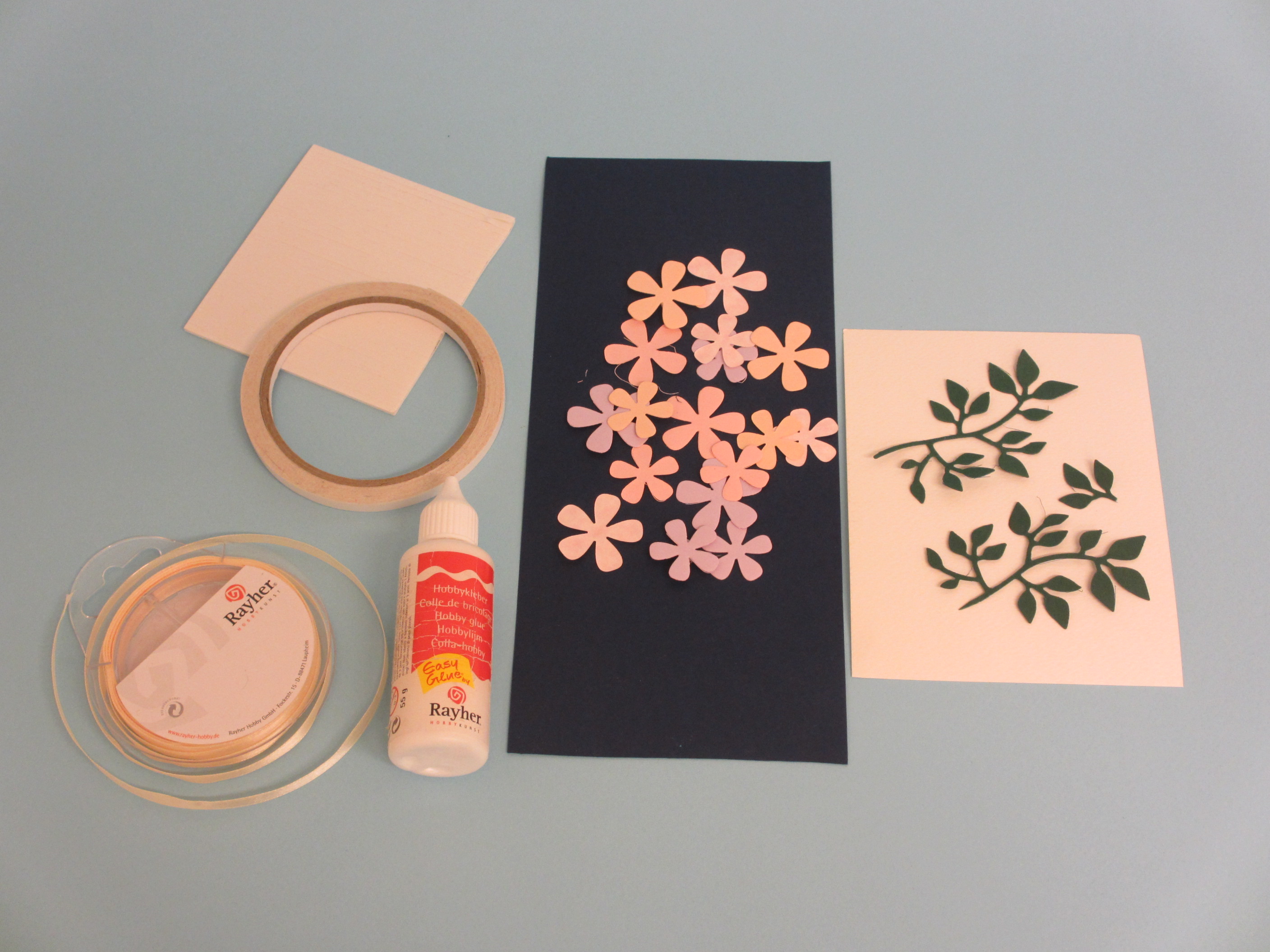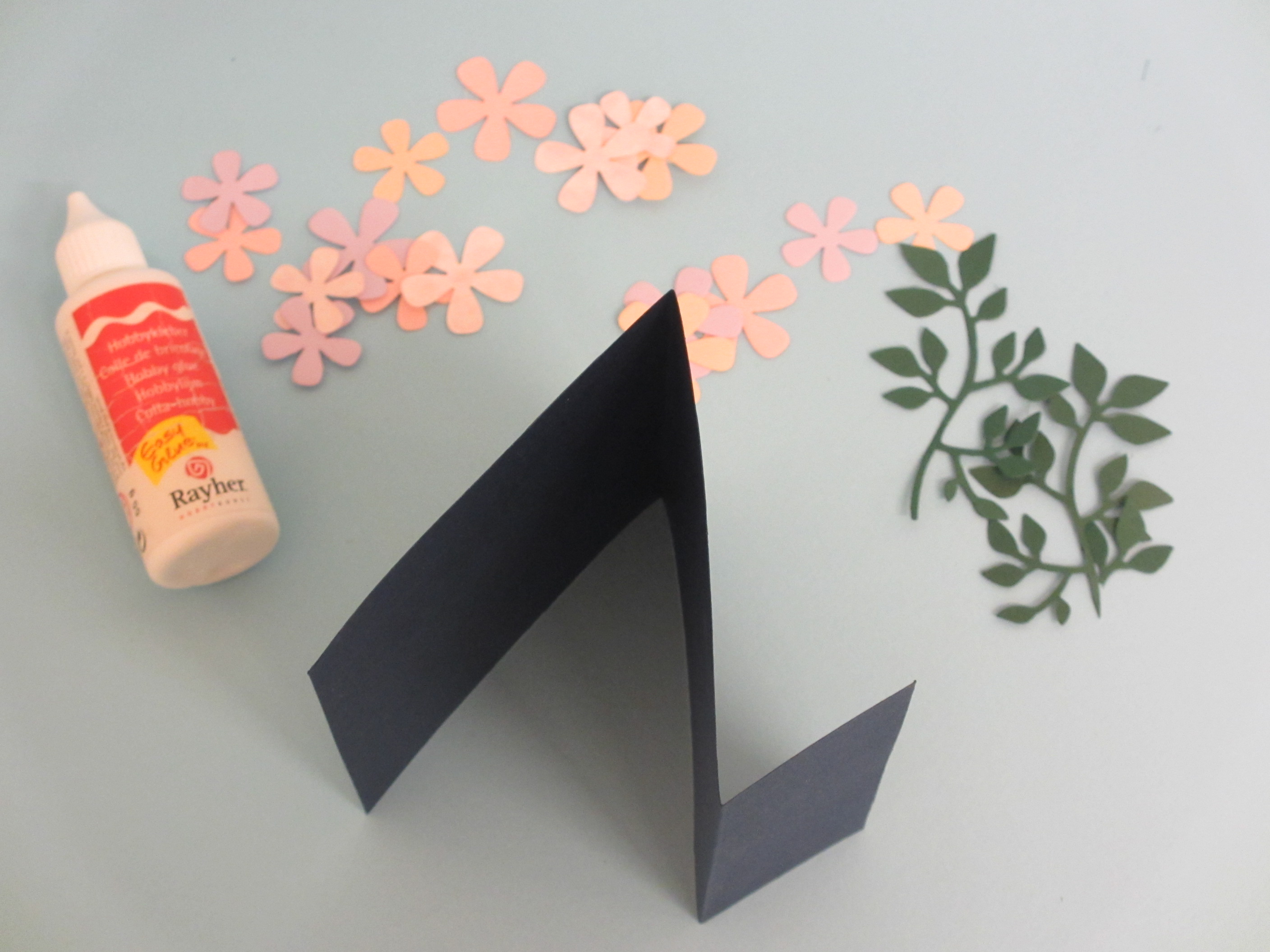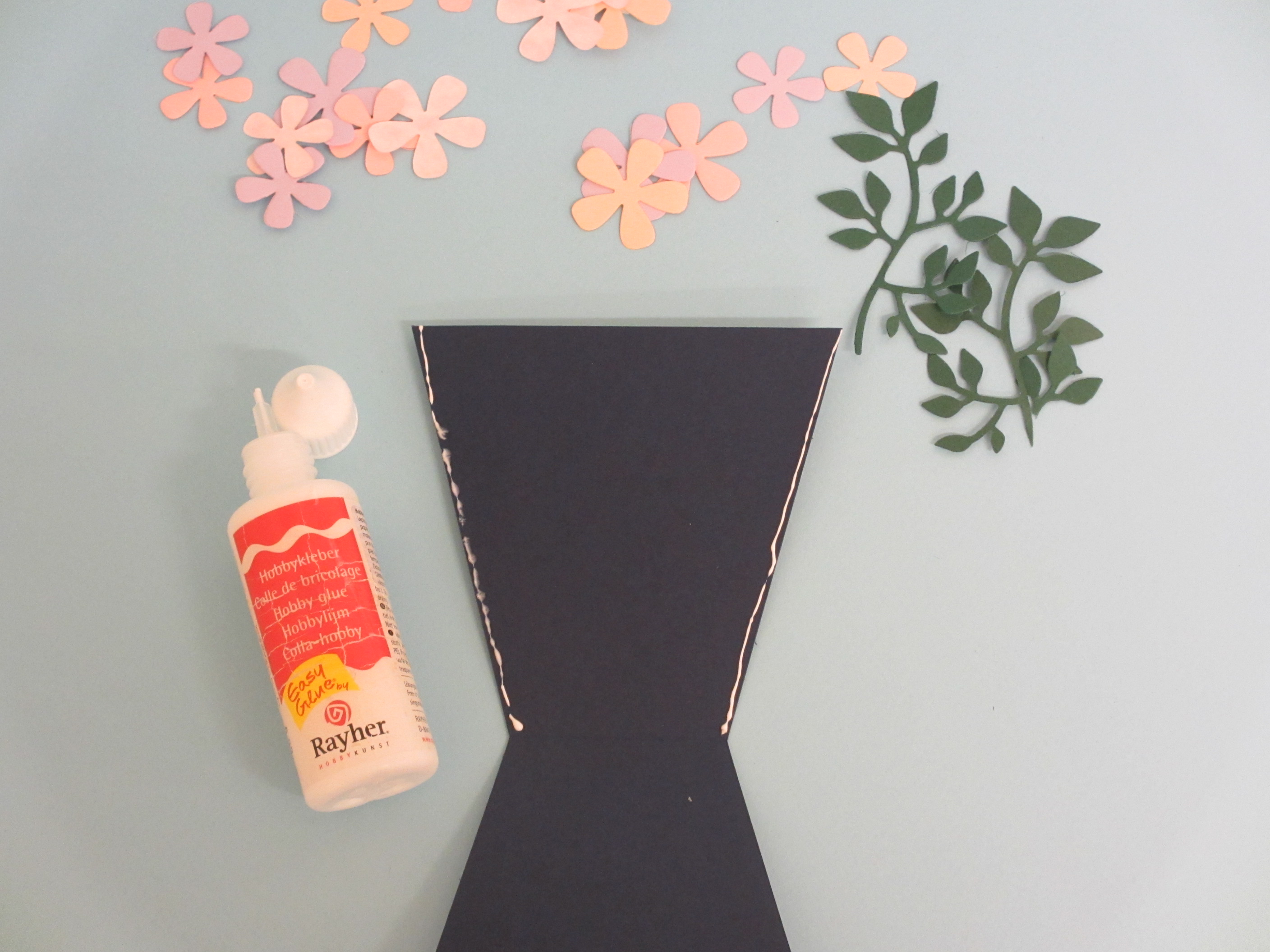 I fiori e le foglie vengono tagliati con il Sizzix Big Shot, ma possiamo anche usare i puncher, fiori di carta già ritagliati, fiori di seta... La base del vaso è piegata come nella foto.