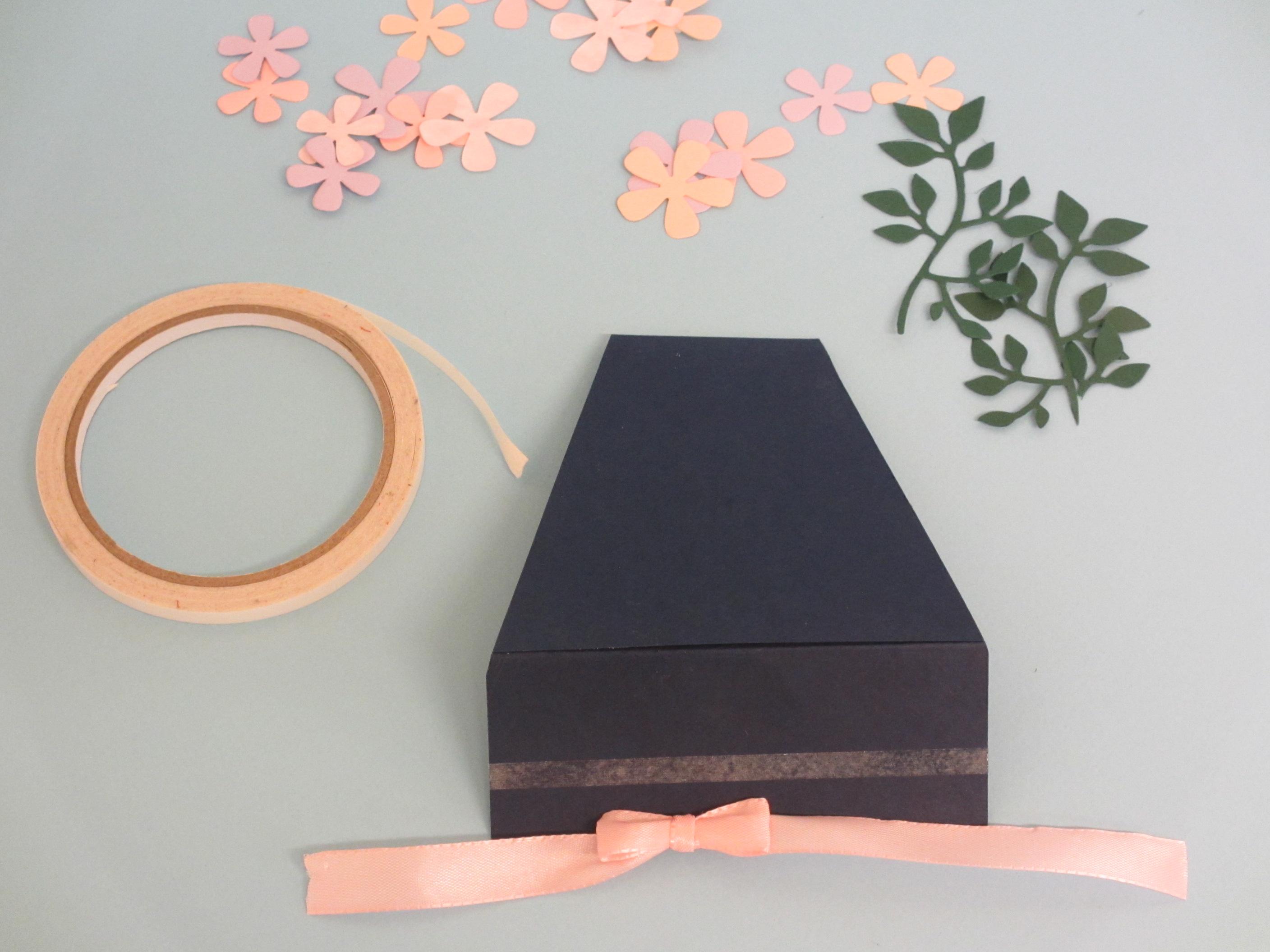 Sulla parte superiore del vaso attacchiamo con un nastro biadesivo il nastro decorativo.
