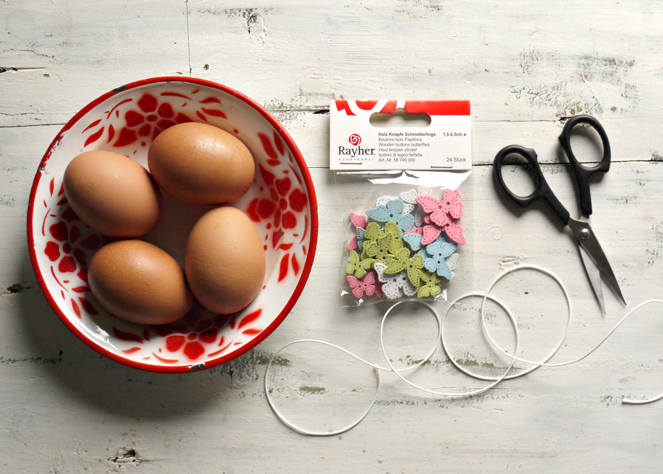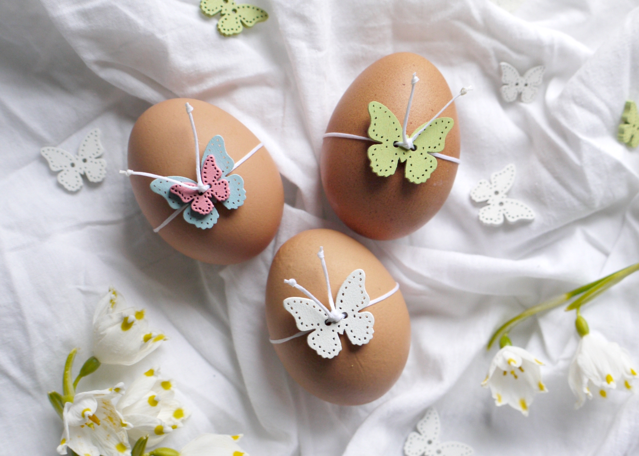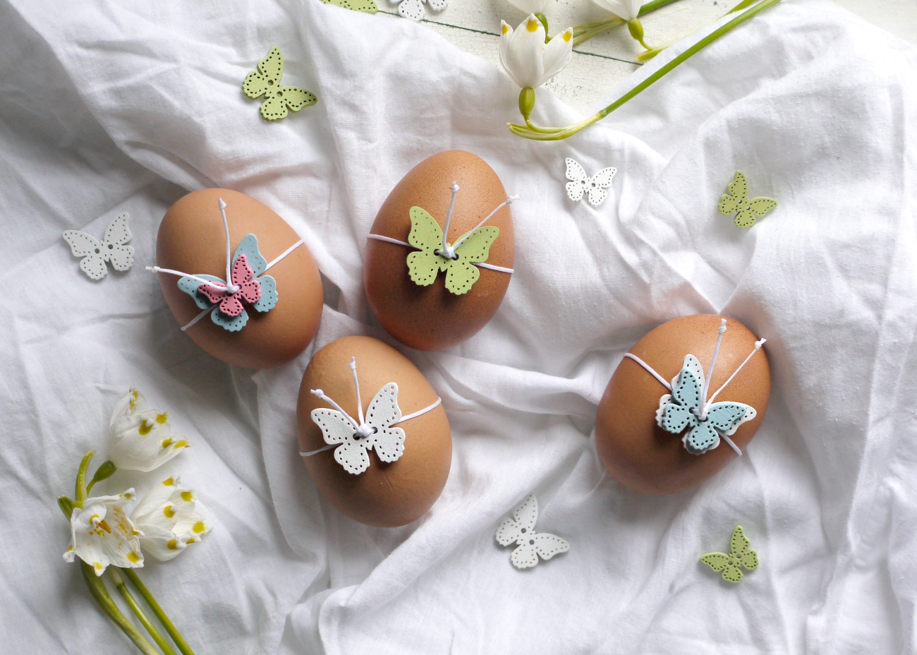 Z lesenimi gumbi v obliki metuljčkov lahko hitro in preprosto okrasimo kuhana jajca in tako dobimo ljubke pomladne pirhe.Potrebujemo: