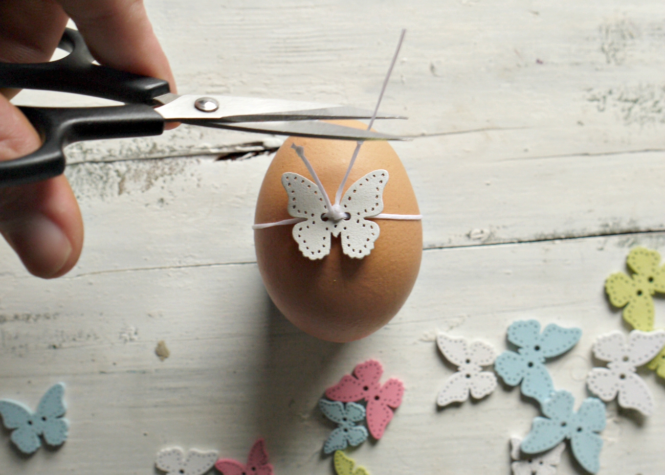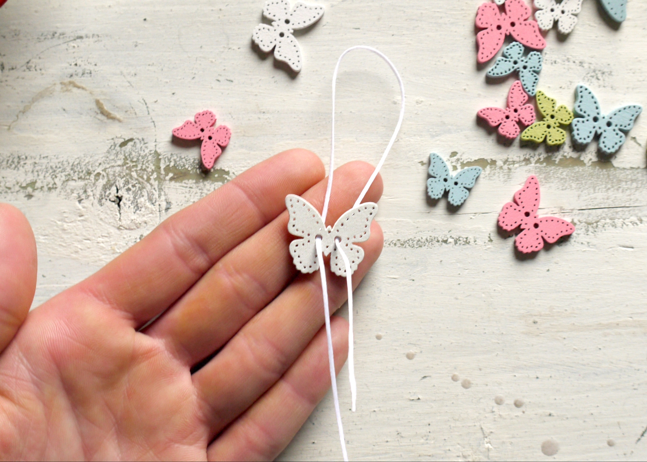 1. Skozi luknjici na gumbu napeljemo vrvico. Ker so metulji različnih velikosti, lahko položimo tudi en gumb na vrh drugega. Zanko nato napnemo okoli jajca in naredimo vozel.