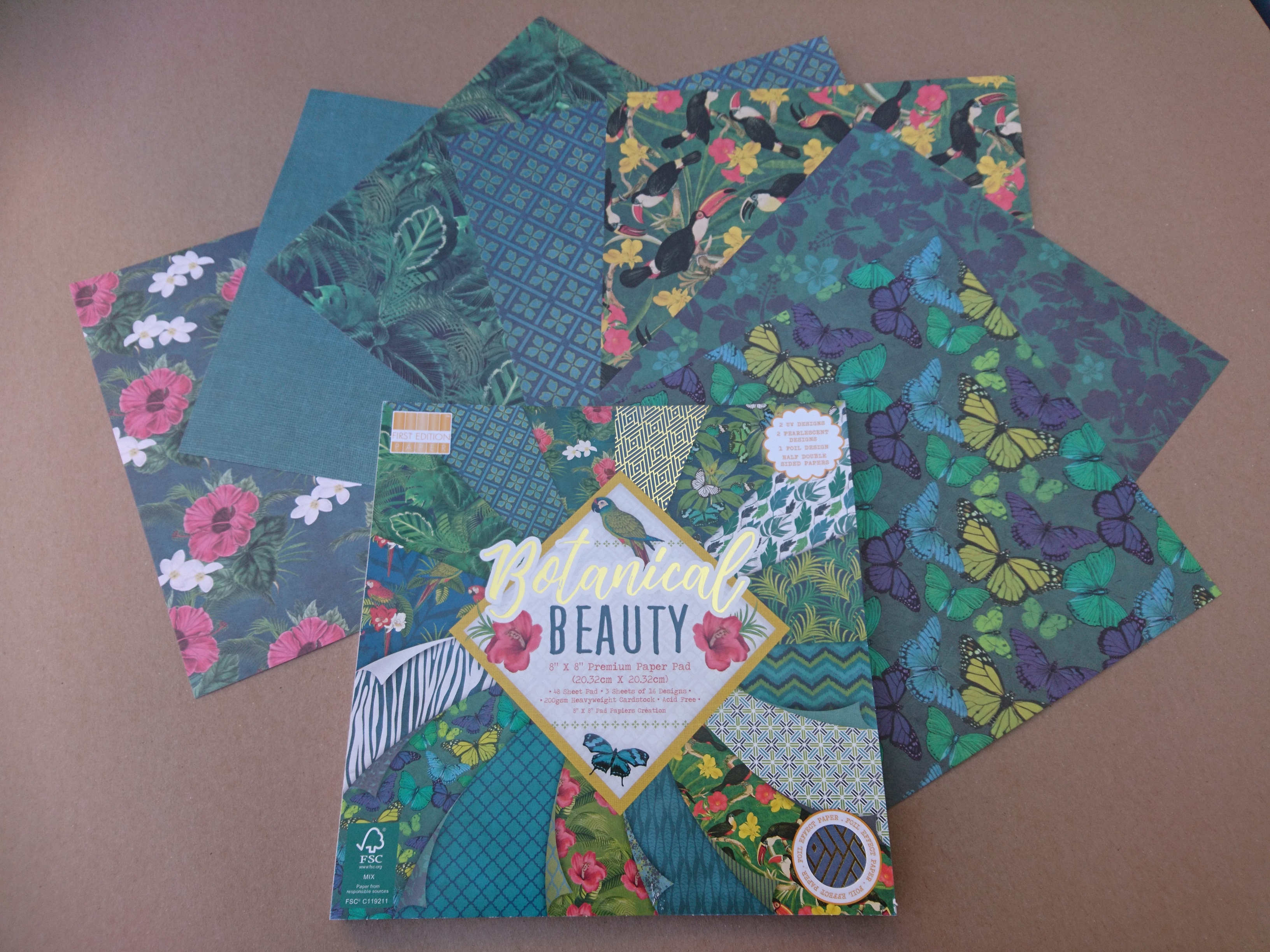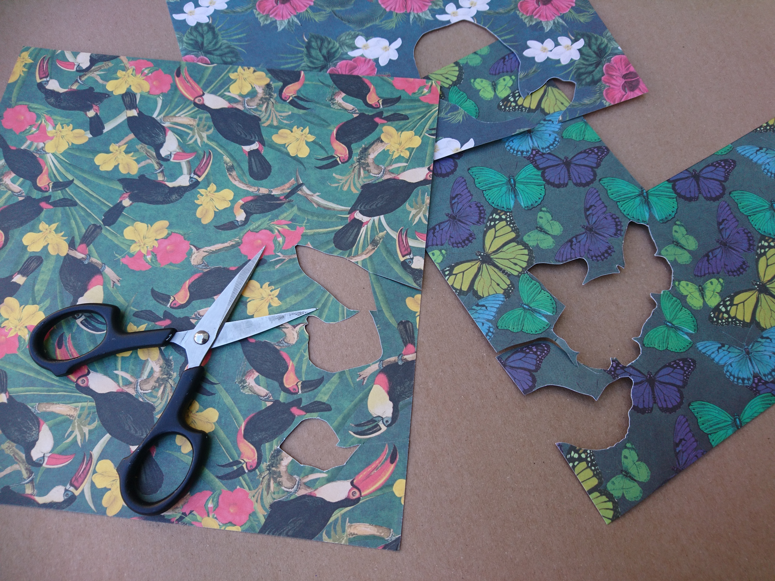 Iz pisanih papirjev z ostrimi škarjicami izrežemo cvetove, metulje in tukana. Izrezane detajle prilepimo s 3D samolepilnimi blazinicami. Ker so papirji v temnejših tonih, uporabimo blazinice črne barve, da se ob pogledu od strani čimmanj vidijo.