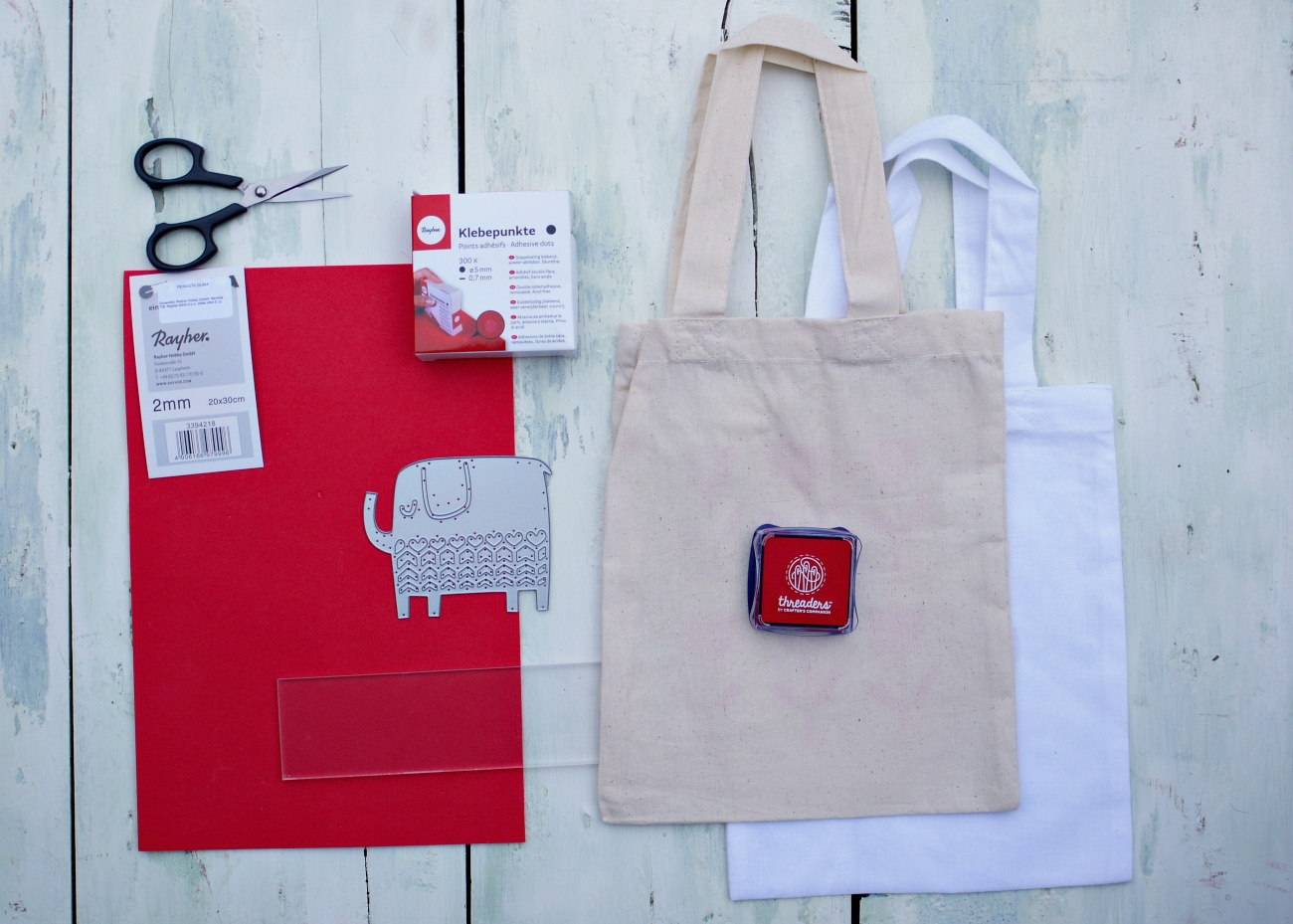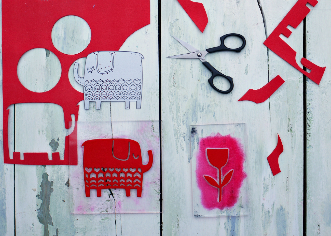 Štampiljko lahko naredimo z izrezovalnimi šablonami. Mi smo uporabili Sizzix Thinlits šablono slončka. Motiv lahko izrežemo tudi s škarjami, mi smo si izbrali preprost tulipan. Z lepilnimi slikonskimi pikicami motiv nalepimo na odtisno ploščo. Ta način lepljenja smo izbrali, ker se najlažje odstrani. Odtisno ploščo potrebujemo, da se motiv lepše odtisne zaradi razporejenega pritiska.