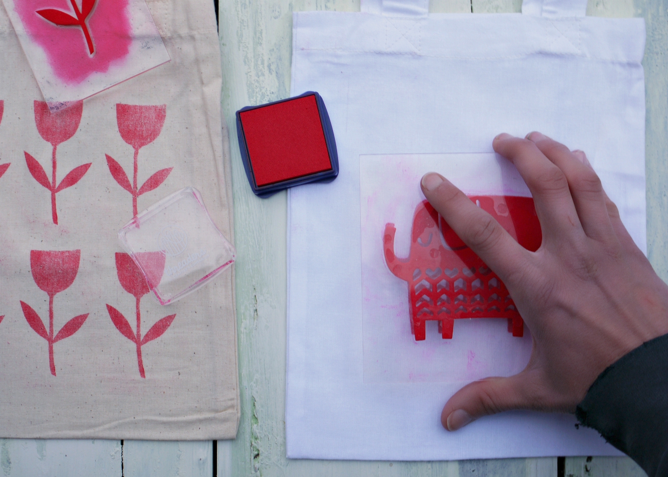 Motiv potapkamo z barvno blazinico in odtisnemo na želeno mesto na tekstilu. Počakamo nekaj minut in motiv polikamo po hrbtni strani, da utrdimo barvo.