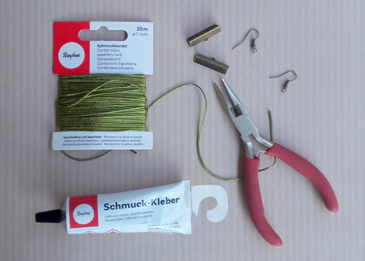 V zaključek nanesemo malo lepila in ga položimo na vrvico. Zaključek stisnemo s kleščami do te mere, da lahko odstranimo lepenko. Nato ga popolnoma stisnemo in dodamo še osnove za viseče uhane.
