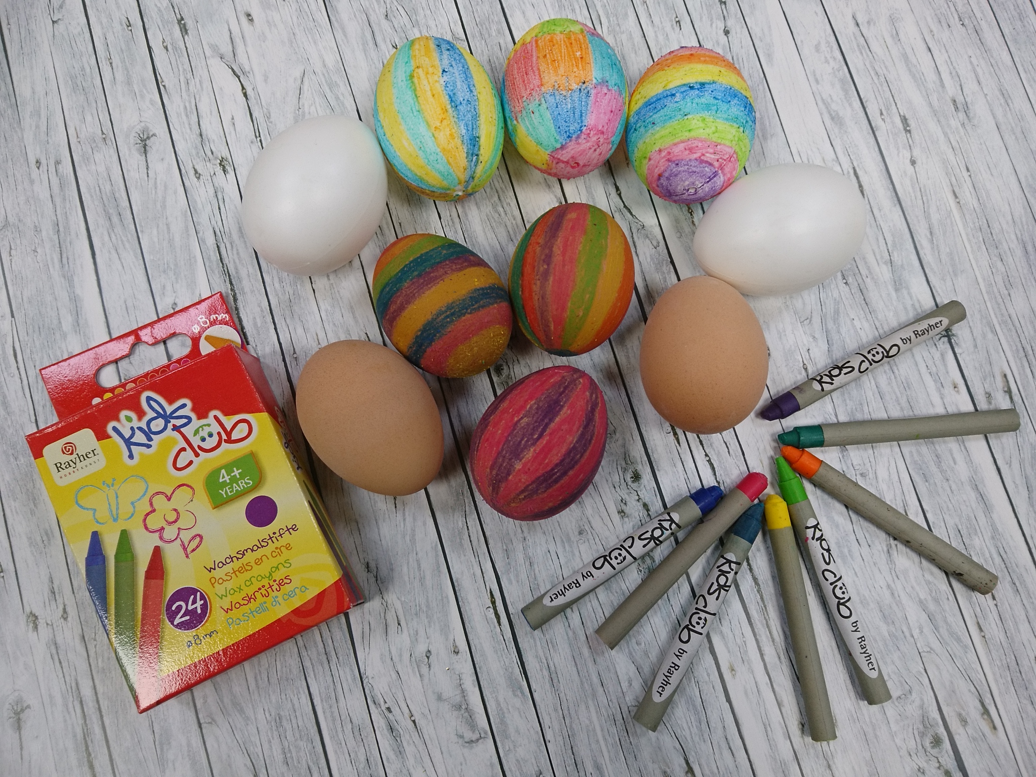 Površino jajca prekrijemo z voščenkami v poljubnih barvnih kombinacijah.