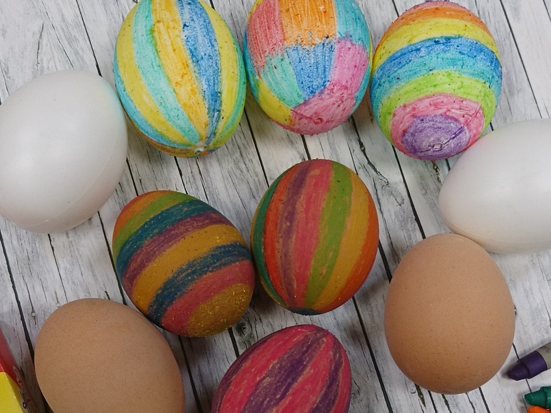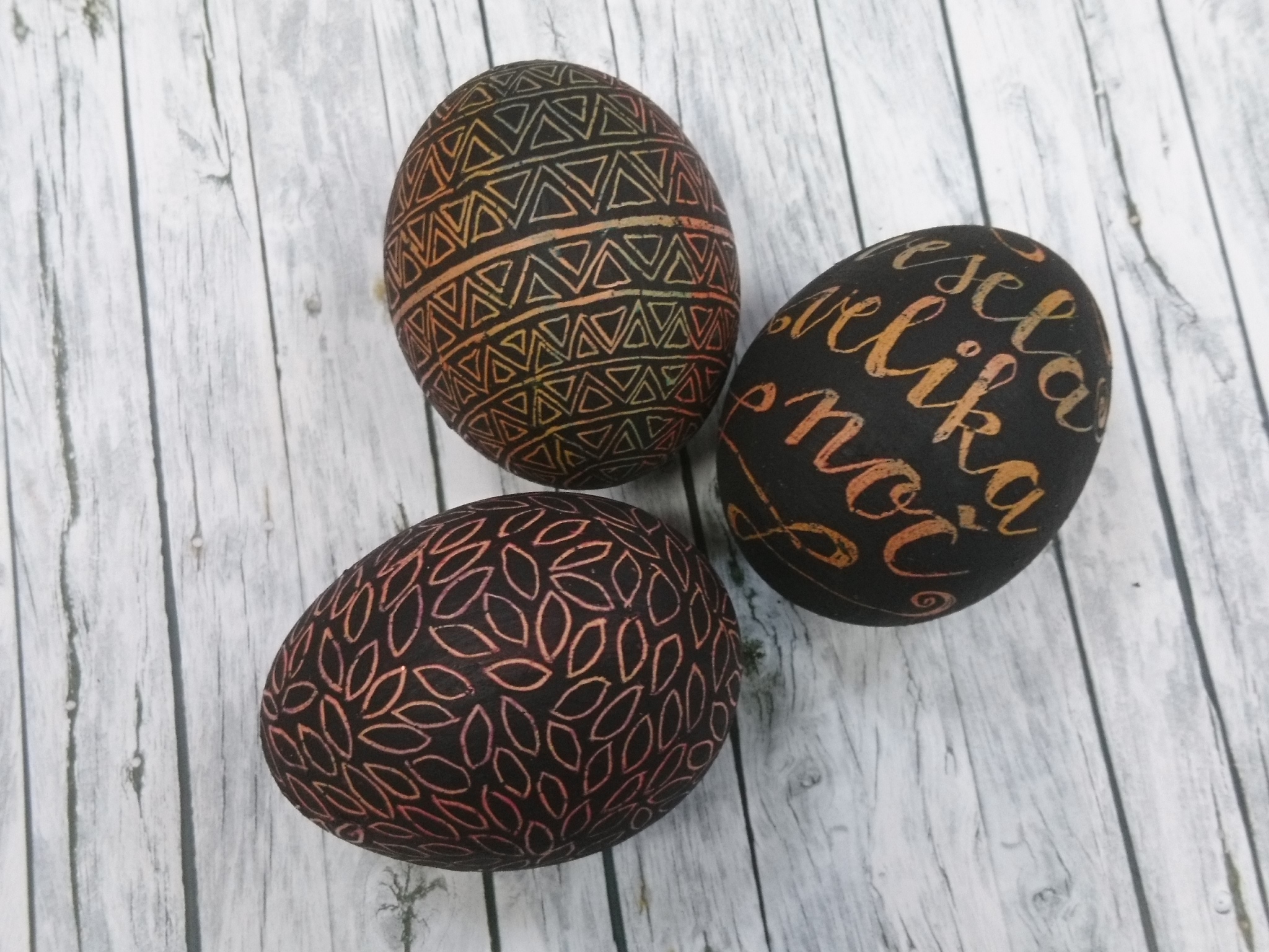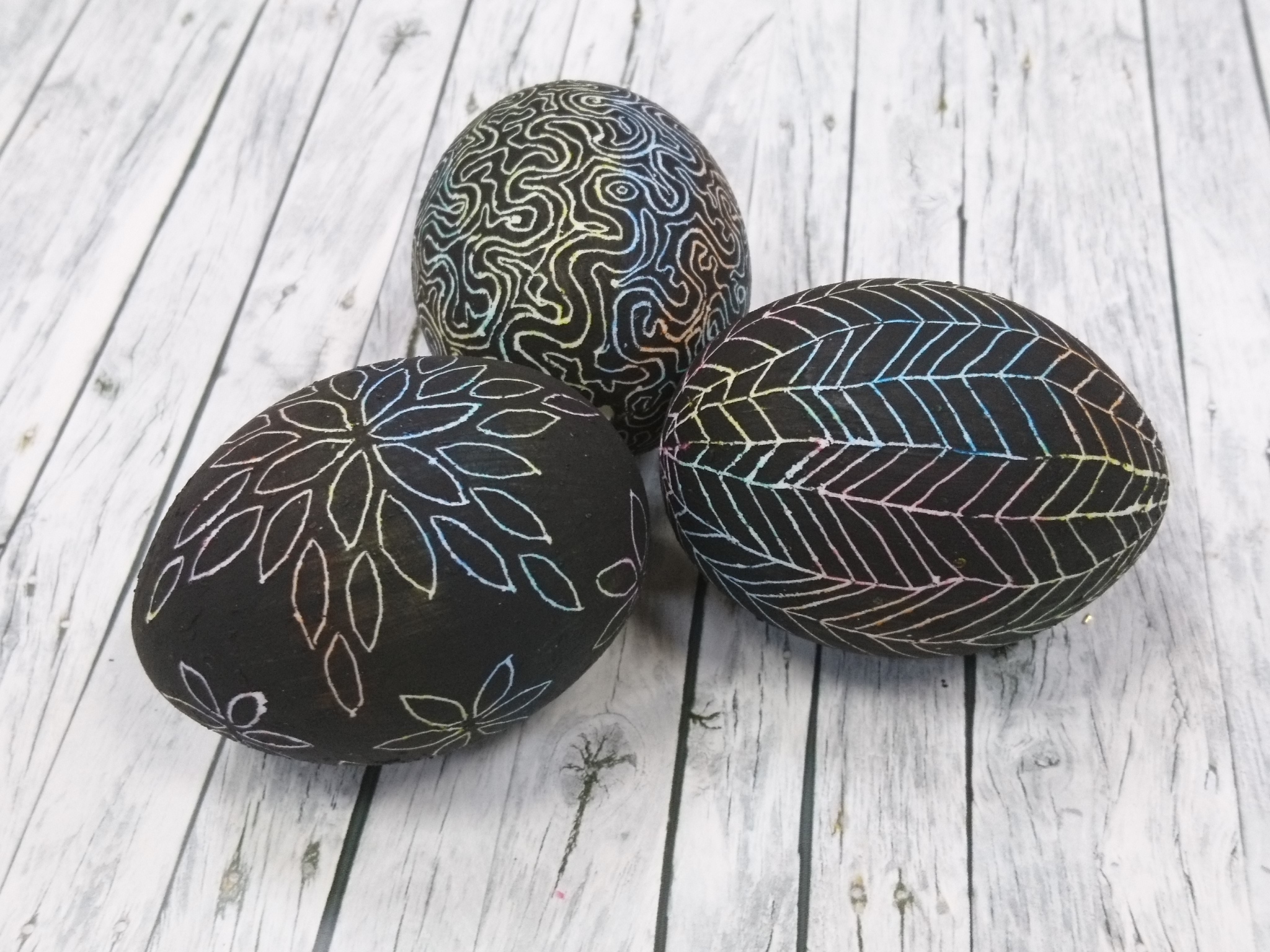 Se spomnite ustvarjanja pisanih praskank pri likovnem pouku, ko smo risalni list najprej prebarvali z voščenkami, pisano površino pa potem prekrili s črno tempero in praskali z zobotrebcem? To tehniko lahko prenesemo tudi na okraševanje pravih ali plastičnih jajc.Za delo potrebujemo: