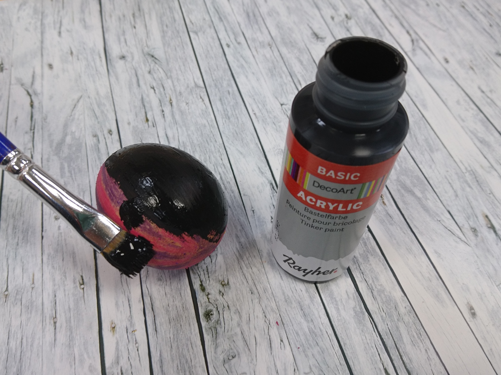 Z voščenkami pobarvano jajce pobarvamo s tanko plastjo črne akrilne barve.