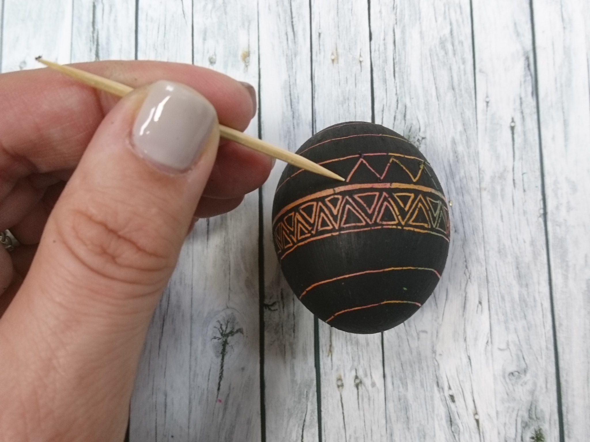 Ko je barva popolnoma suha, z zobotrebcem začnemo z odstranjevanjem črne barve.