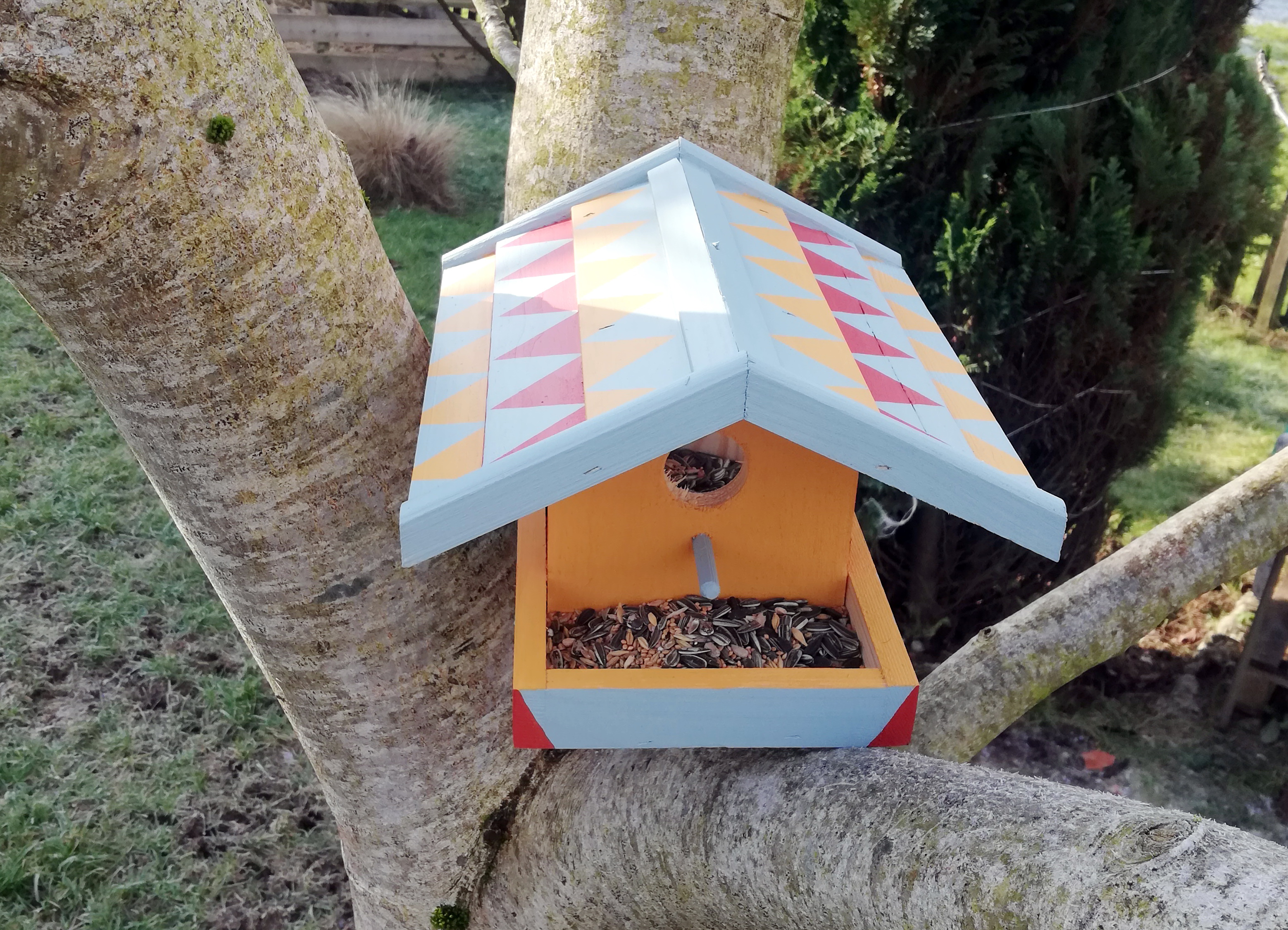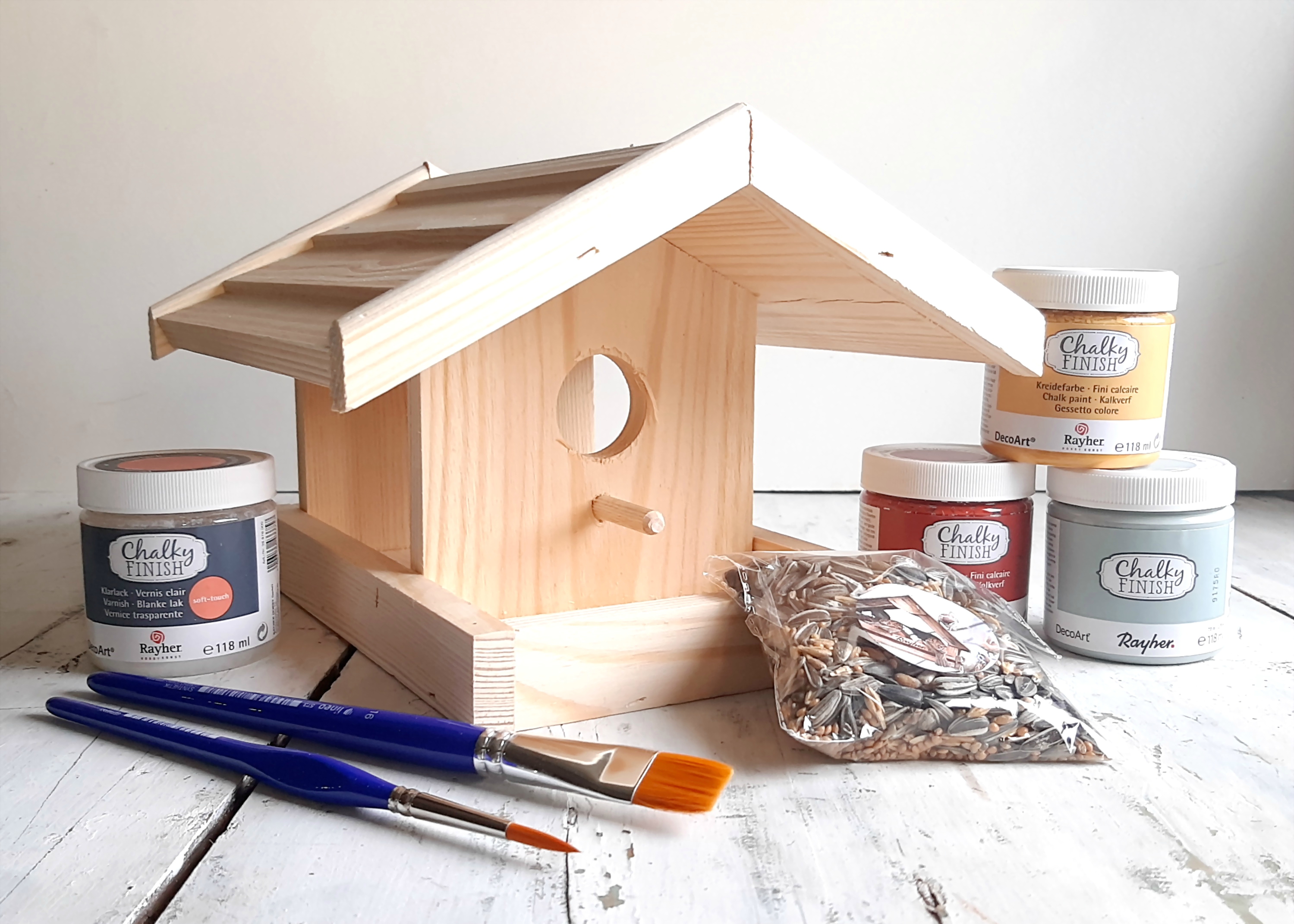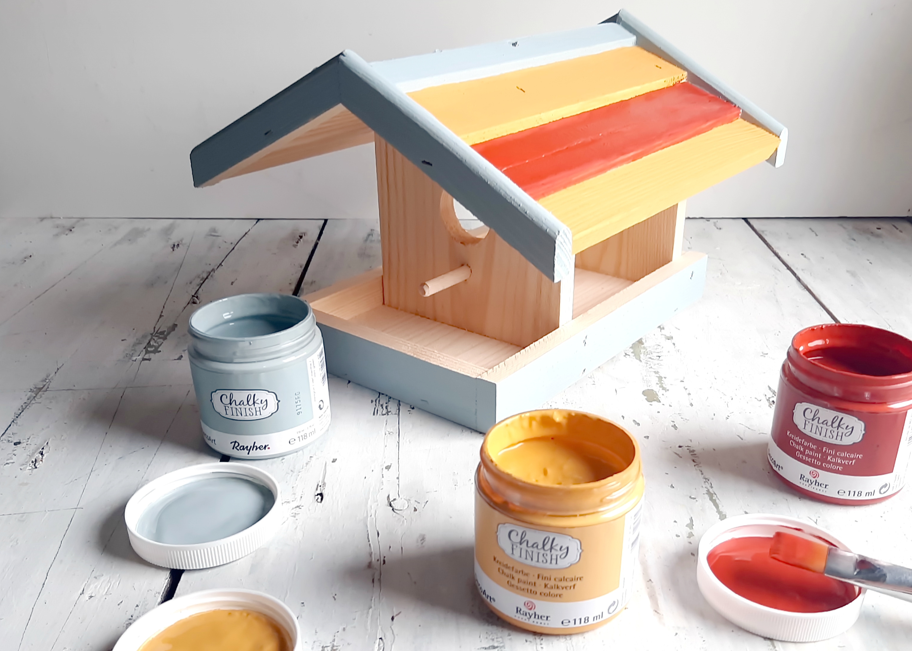 Ptičjo hišico polepšamo z živahnimi barvami Chalky Finish, ki omogočajo odlično prekrivnost in hkrati tudi zaščito lesa pred vremenskimi vplivi.
