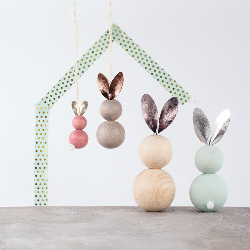 Iz lesenih kroglic lahko izdelamo ljubke obeske - zajčke, ki jih uporabimo za velikonočno dekoracijo.