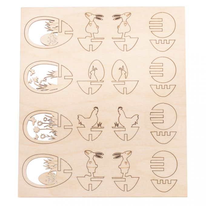Preostane nam le še sestavljanje, kjer sledimo slikovnim navodilom na embalaži. Stike posameznih plošč utrdimo z lepilom za les in našo sestavljanko namestimo v prozorno plastično jajce. Skozi zanko napeljemo dekorativno vrvico in velikonočna dekoracija je pripravljena.