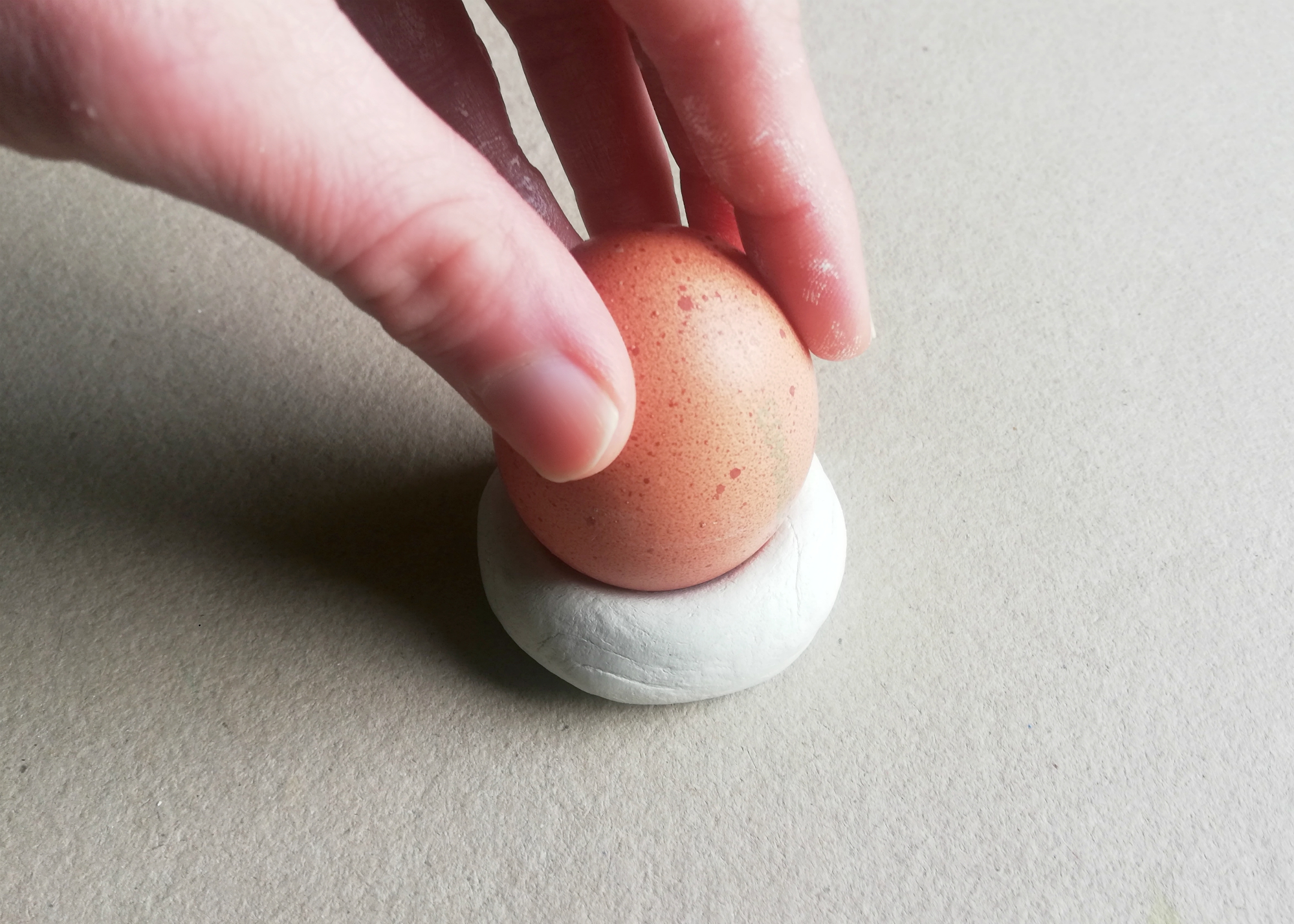 1. Iz modelirne mase oblikujemo kroglico. Vanjo nato potisnemo trdo kuhano jajce, da dobimo vdolbino, v kateri bo pirh stabilen. Iz te osnove oblikujemo gnezdo, ki ga nato poljubno pobarvamo in poslikamo z akrilnimi barvam in zaščitimo z akrilnim lakom.