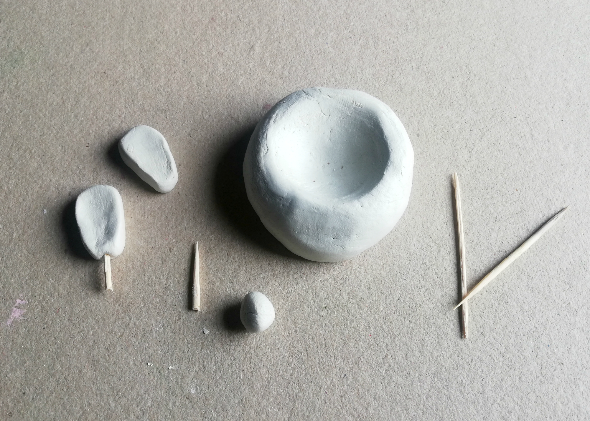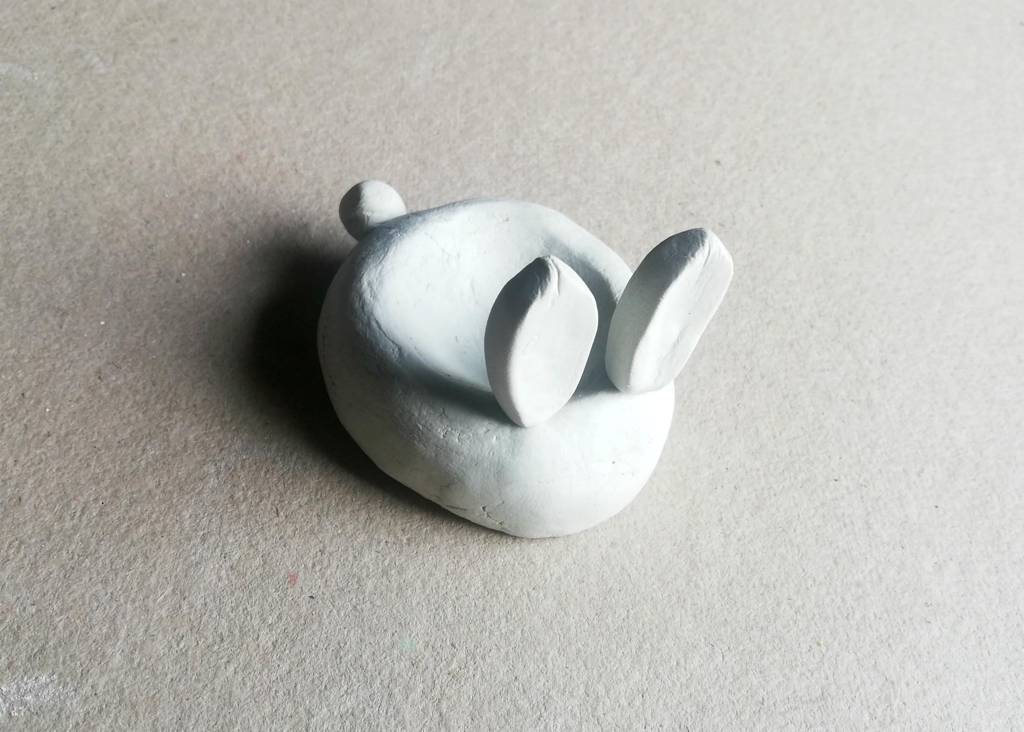 2. Iz te osnove lahko nadaljujemo z oblikovanjem zajčka, ki mu naredimo še ušesa in repek. Pritrdimo jih s pomočjo zobotrebca, ki ga vtisnemo v majhne delčke. Ko se masa posuši, bo morda potrebno dodati tudi kapljico lepila, da bodo ušesa in repki stali na želenem mestu.