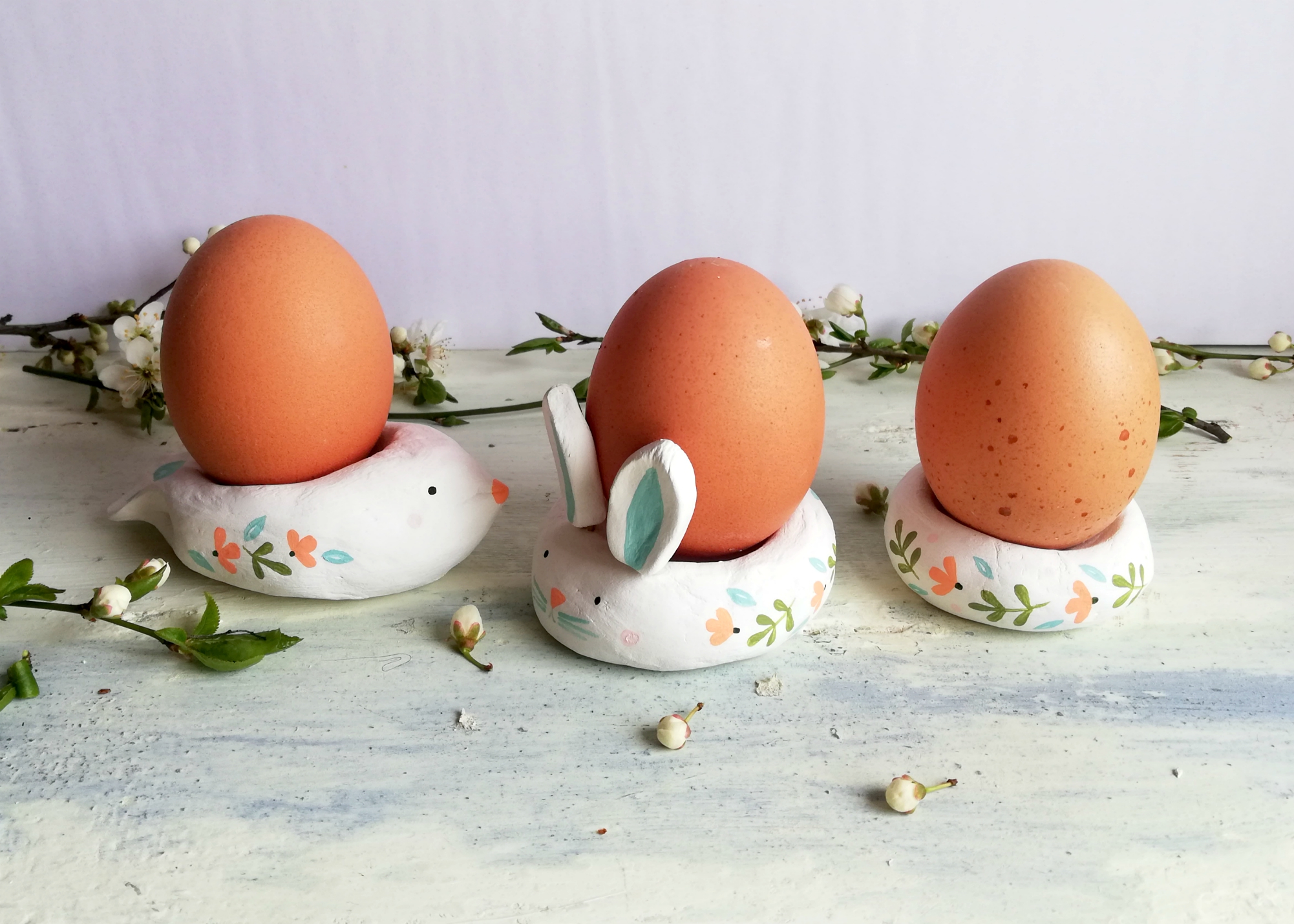 Iz modelirne mase, ki se suši na zraku, lahko skupaj z otroci naredimo pomladna gnezda, zajčke in ptičke - podstavke za pirhe.
