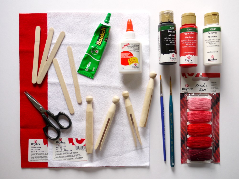 Potrebujemo lesene ščipalke z okroglim vrhom, lesene palčke, akrilne barve, barvno prejo za vezenje ali volno, filc, univerzalno lepilo, Scotch lepilo ali lepilo za filc, čopič in škarje.