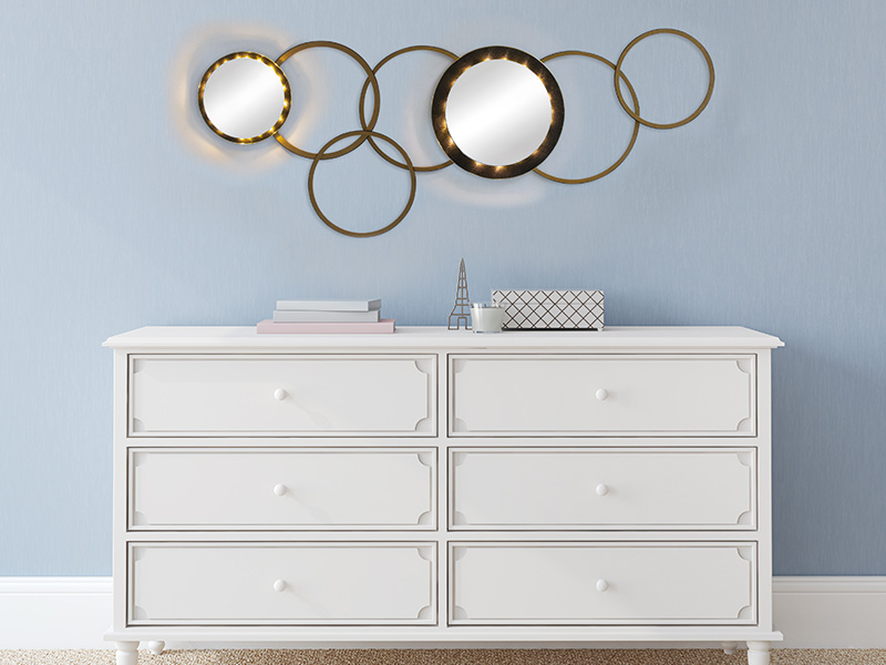 S pomočjo dvostranskega lepilnega traku nalepimo mikro LED svetilke ob rob hrbtne strani ogledala. Svetlobne pike ne smejo gledati izza roba ogledala.