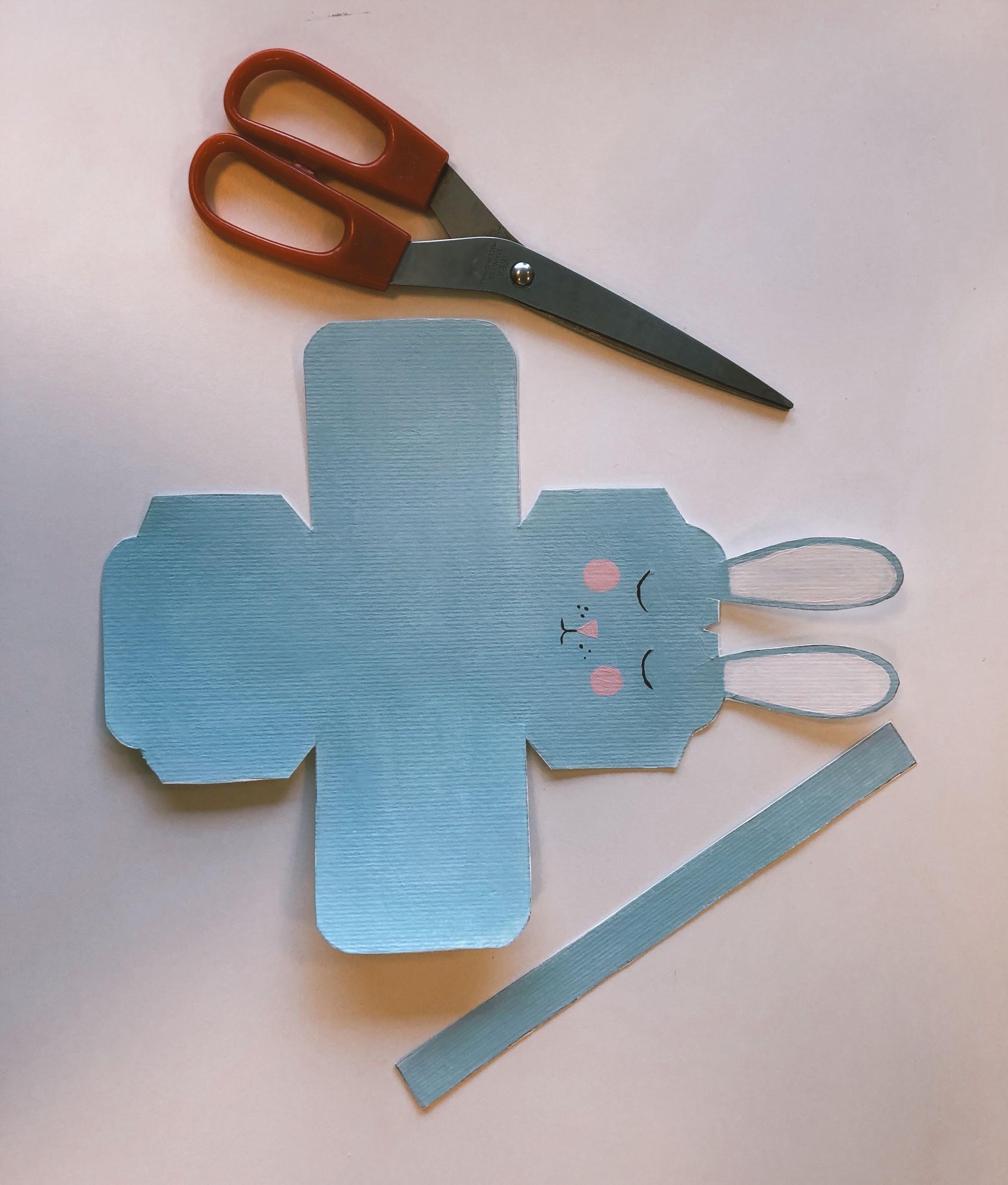 Najprej natisnjeno predlogo izrežite po zunanjih robovih. Nato predlogo uporabite kot šablono in na debel list narišite obris le-te (mi smo uporabili 300g papir). Trši papir smo izbrali, da bo košarica z lahkoto prenašala pirhe in čokoladna jajca. Če nimate 300g papirja lahko uporabite tudi kakšno škatlo.