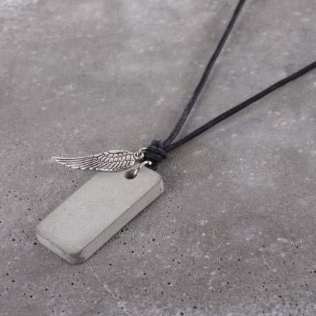 Eventuali bordi irregolari sul ciondolo possono essere leggermente levigati con carta vetrata fine. Con una pinza per gioielli, apriamo l'anello più piccolo inserendolo nella piuma d'angelo. L'anello più grande viene inserito nel foro del ciondolo di cemento e la piuma è posta su di esso.