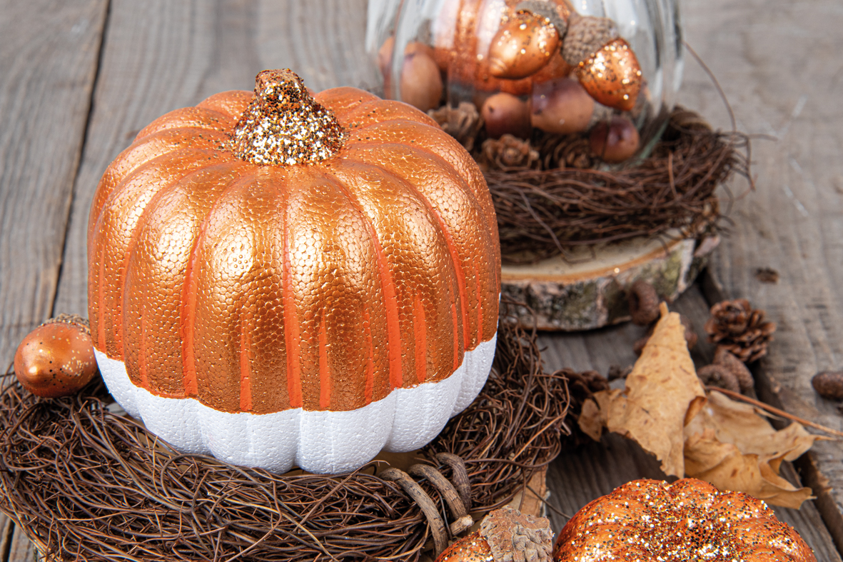 Ko se sloj bele barve posuši, lahko nadaljujemo z nanosom bronaste barve Extreme Sheen. Vzamemo večjo ter srednjo bučo, ter ju z največjim čopičem pobarvamo od vrha do polovice.