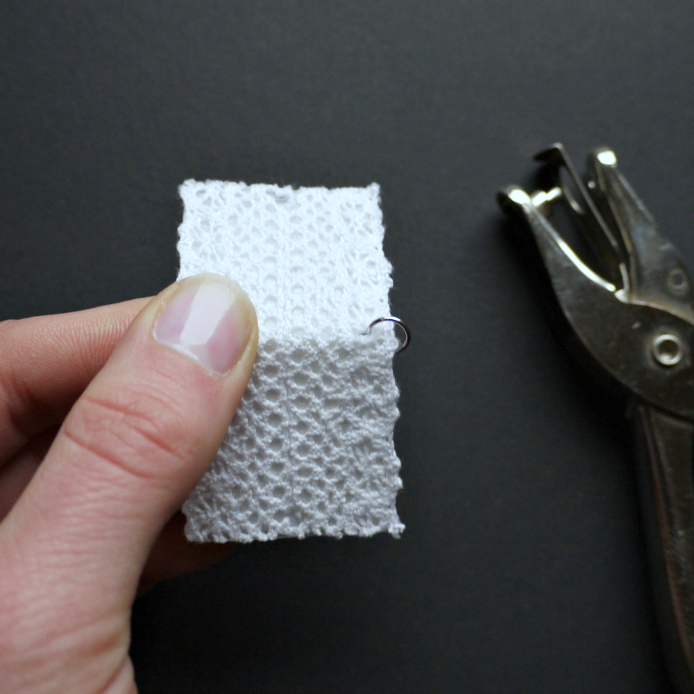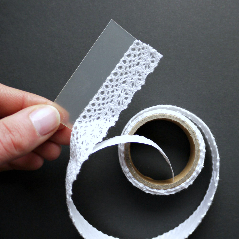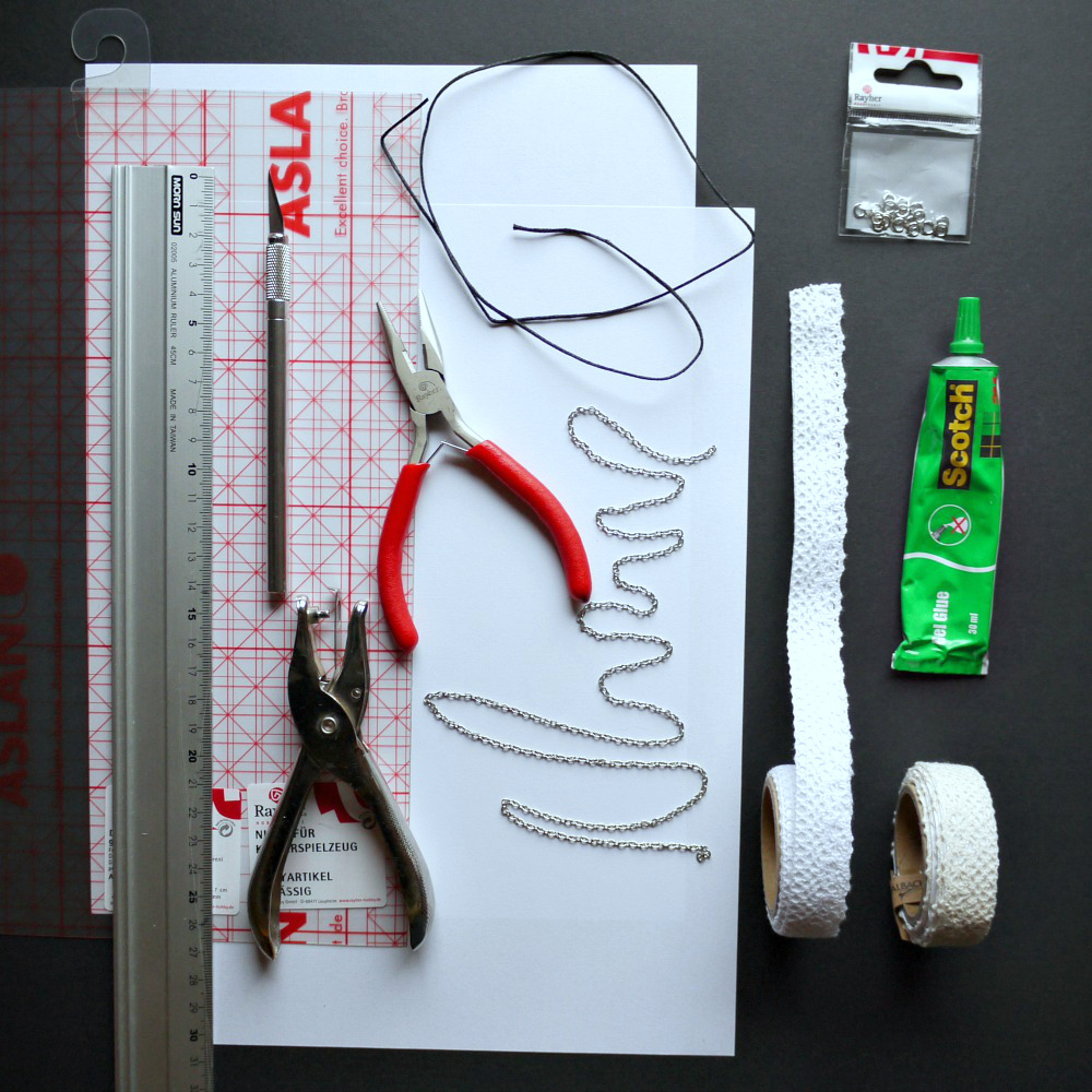 Necessitiamo: carta bianca, washi tape con pizzo, lamina biadesiva, anellini per gioielli, collana, spago, bisturi o coltello, righello, pinze, perforatrice e colla.