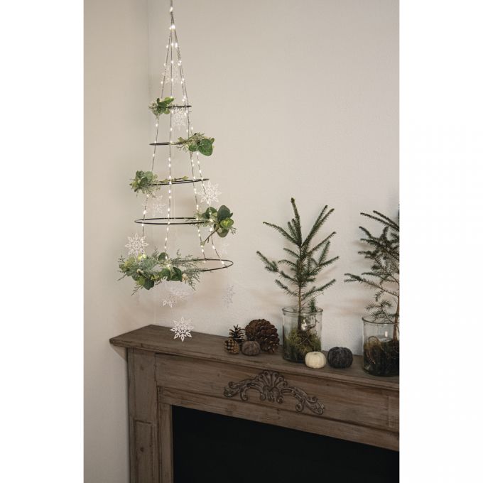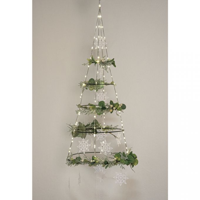 Pritrdite lučke na prejo. Potegnite pramen luči od zgoraj navzdol vzdolž vseh 4 pramenov preje. Sedaj je osnova končana in lahko okrasite posamezne kovinske obroče z različno dekoracijo. Najbolje je, da posamezno dekoracijo pritrdite na kovinske obroče s cvetličarsko žico. S pištolo za vroče lepilo lahko vmes prilepite tudi posamezno jagodičevje, storžke,..